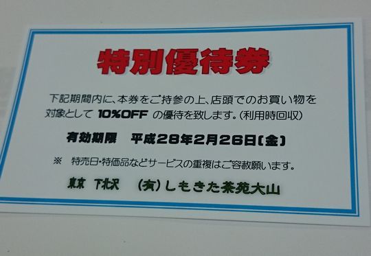 講義に出たから、しもきた茶苑さんの特別割引券もらえたんだあっ。