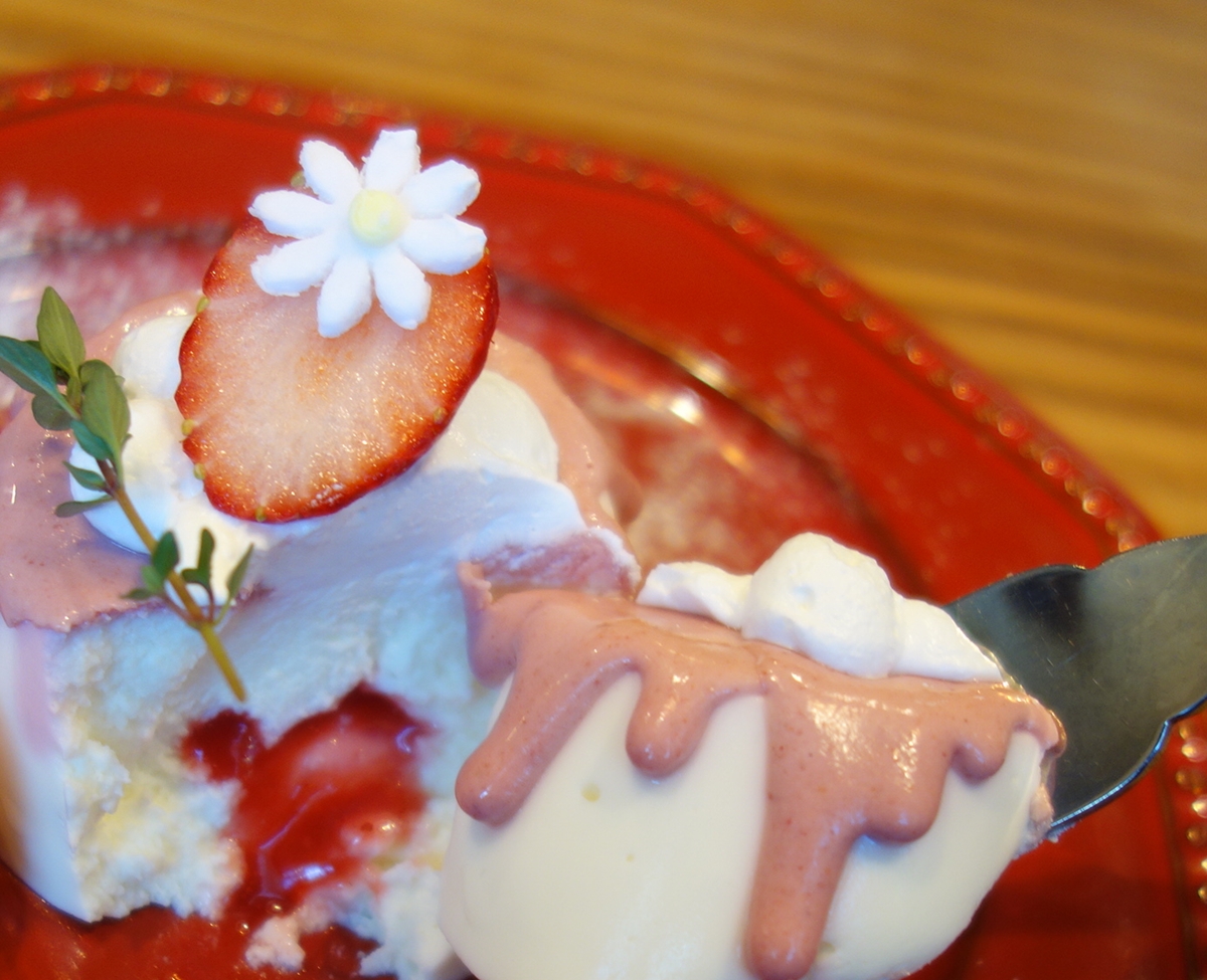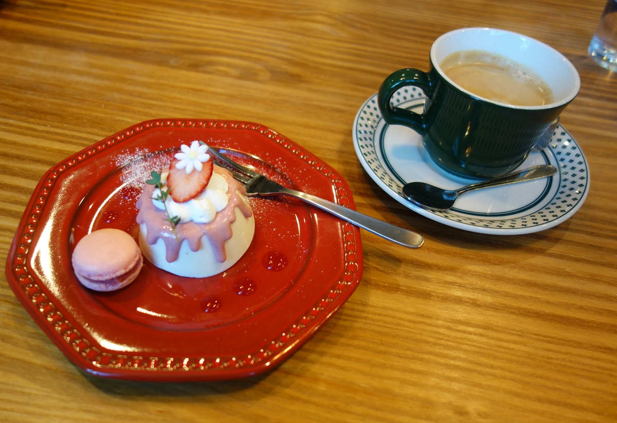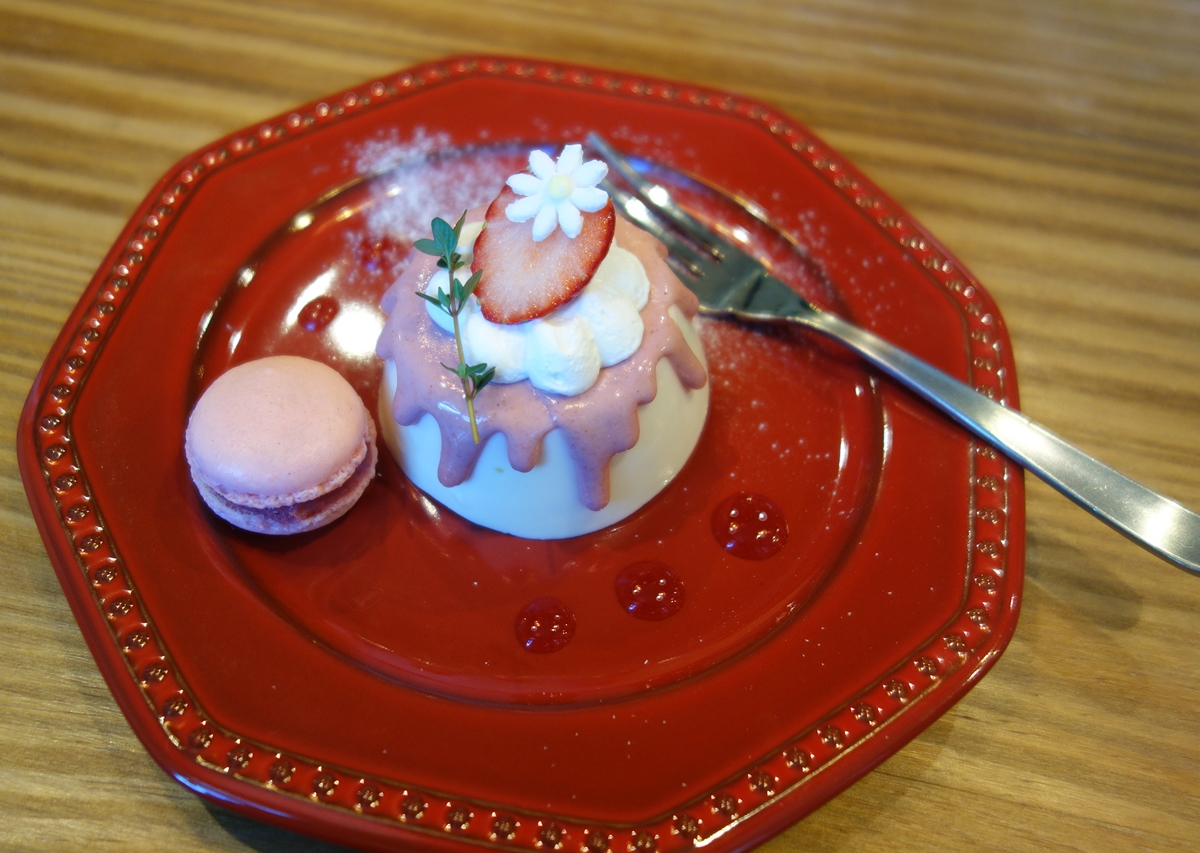 「いちごソース入りレアチーズとマカロン」(+300円)。