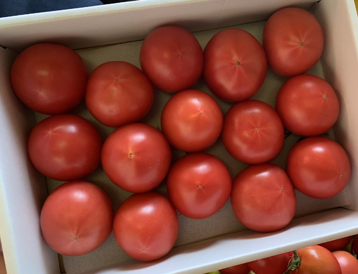 夫「トマトの山をしばし眺めて、同じような大きさのを選んで詰めていけば簡単」