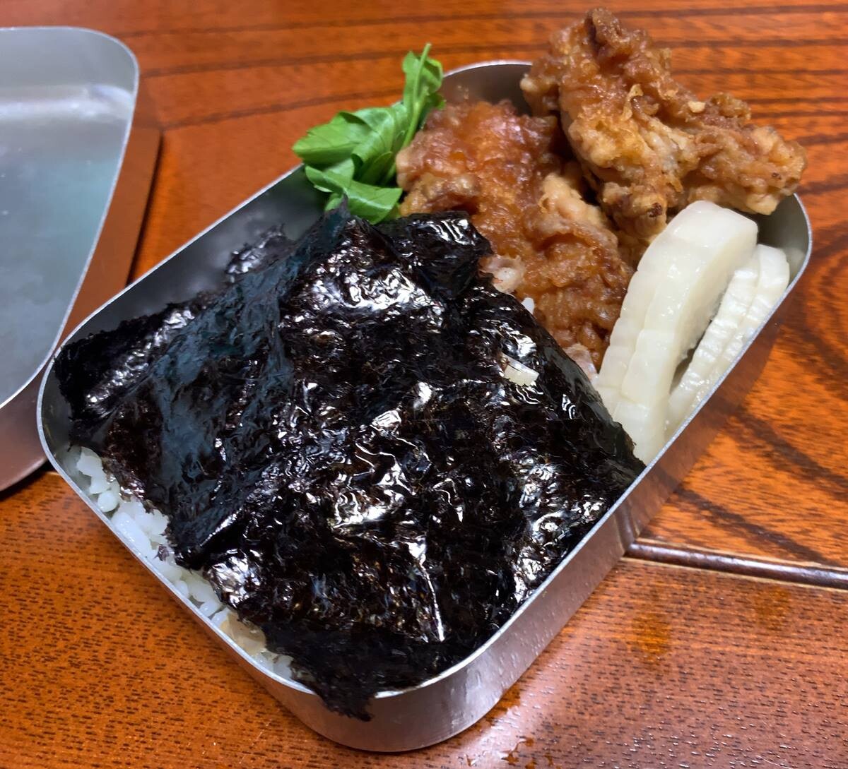 唐揚げ入りのり弁を作ってみました。(即物的な弁当)。