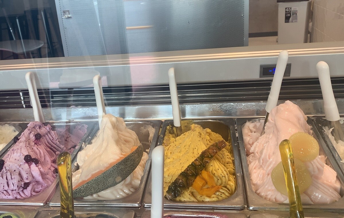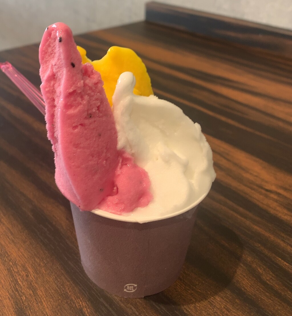 夫「俺は試食はいいです。トリプルで、マンゴー、ドラゴンフルーツ、ライチ。カップで」