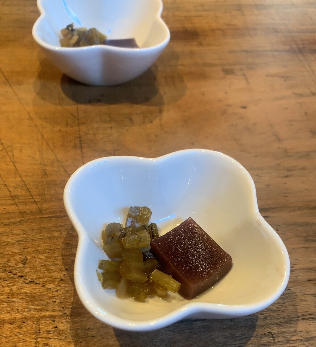 写真は最後になりましたが、わさびの葉の漬物と羊羹が最初に出ました。