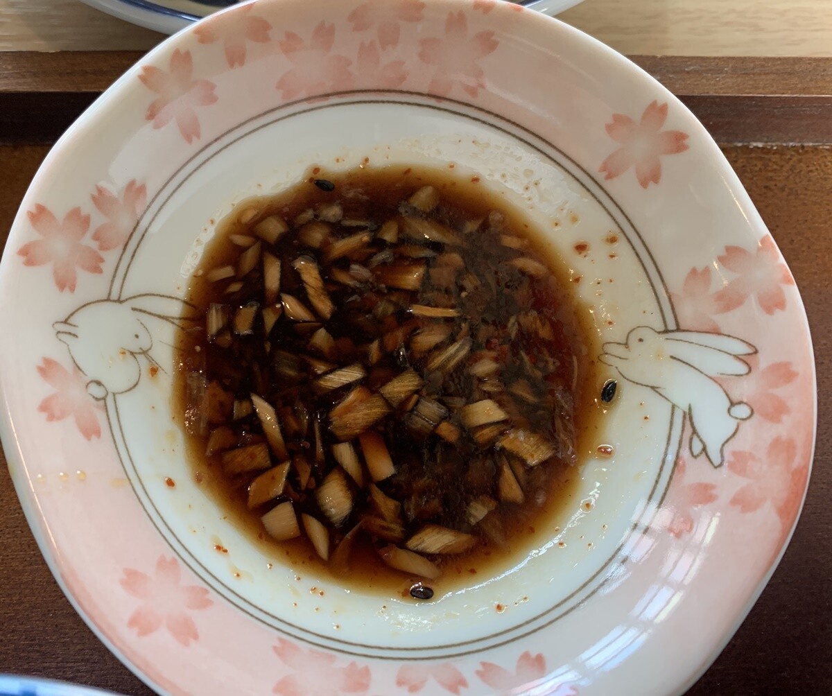 自家製のタレ(黒酢だろうか)につけて