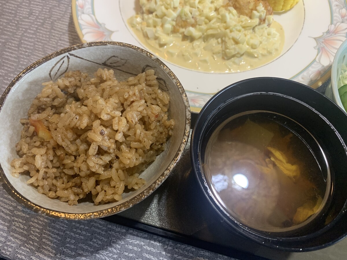 黒玉ねぎの炊き込みご飯なので、黒いのです。