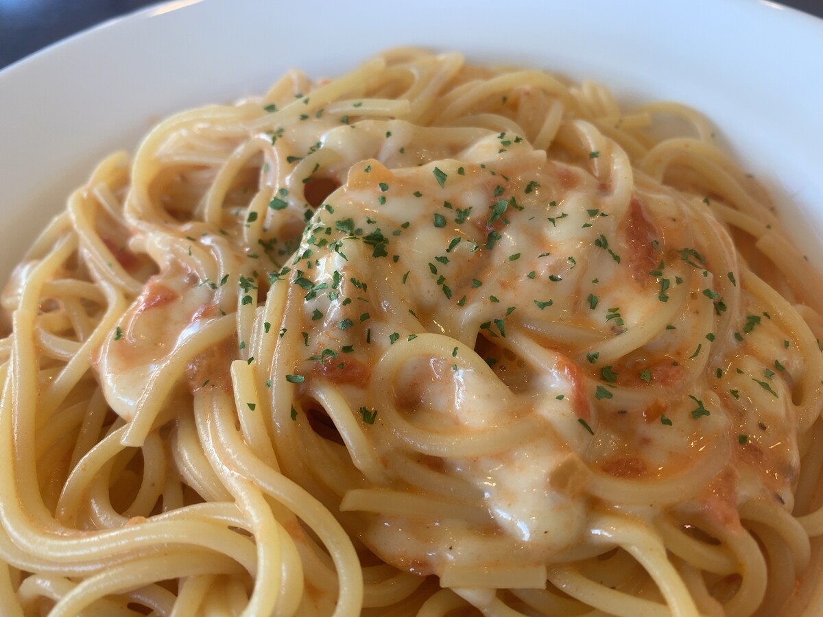 こちらが、モッツァレラチーズのトマトクリームパスタ。