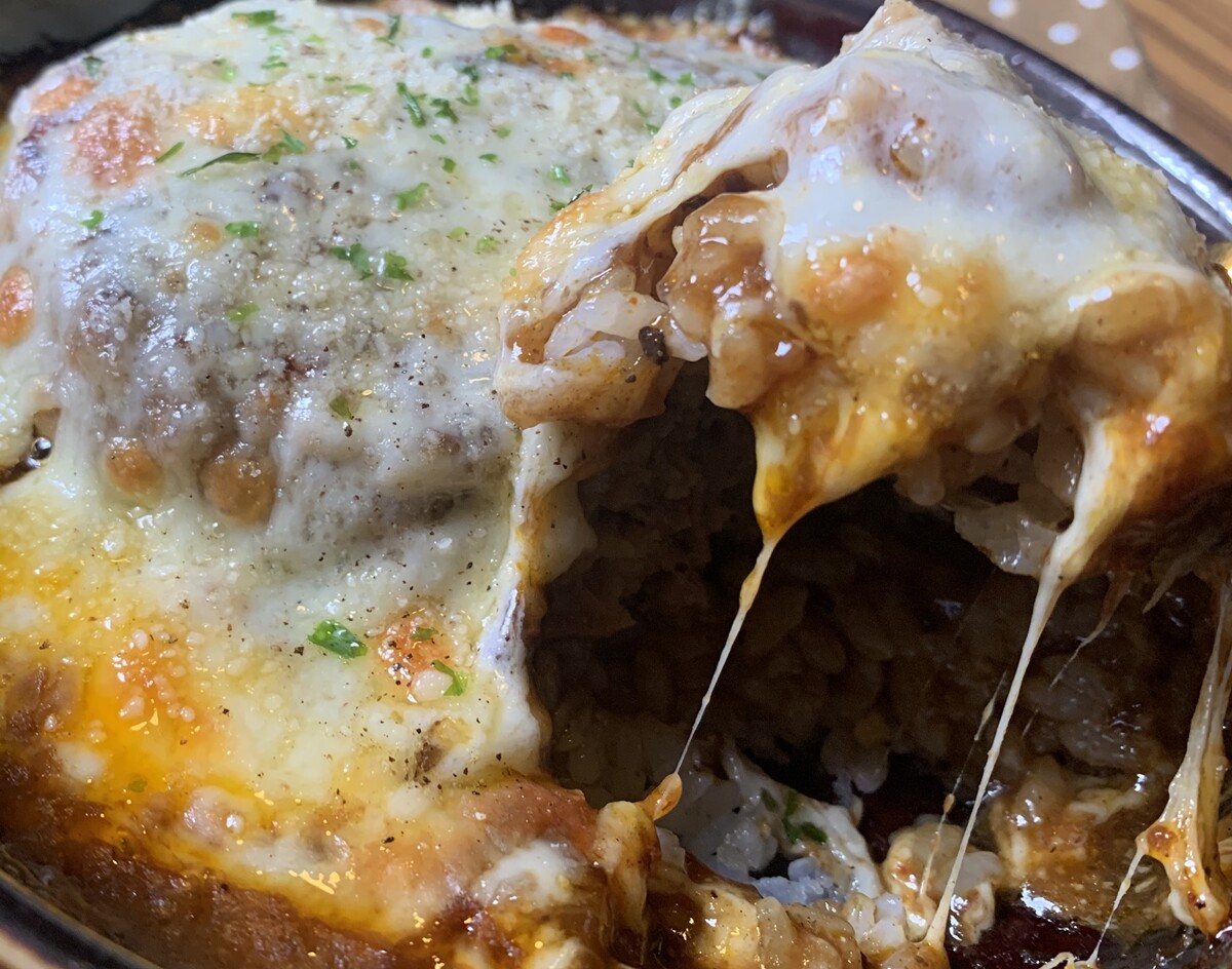 カレーの辛さをチーズがマイルドにしてくれて、ハンバーグが肉女に慶びをもたらす。