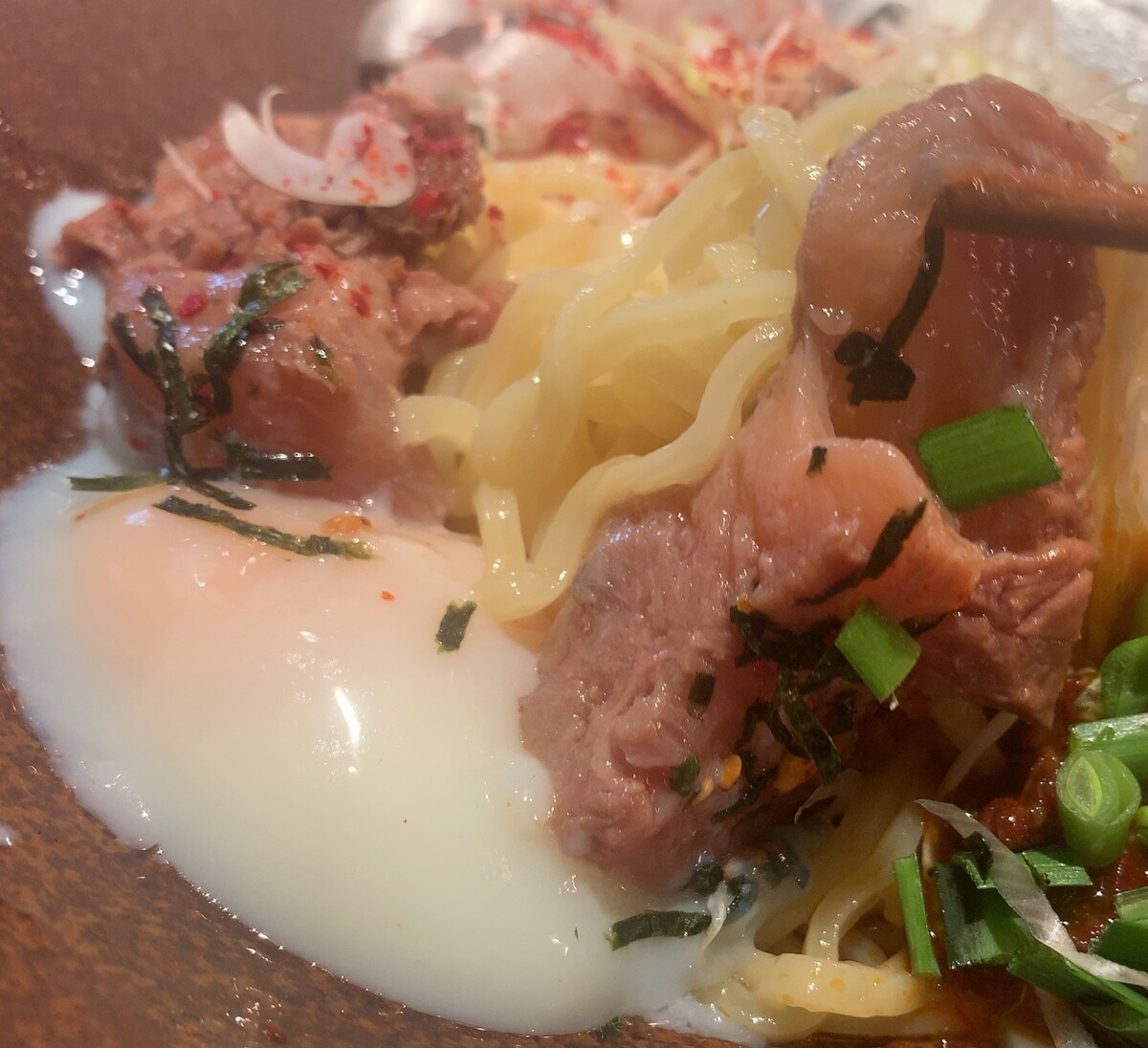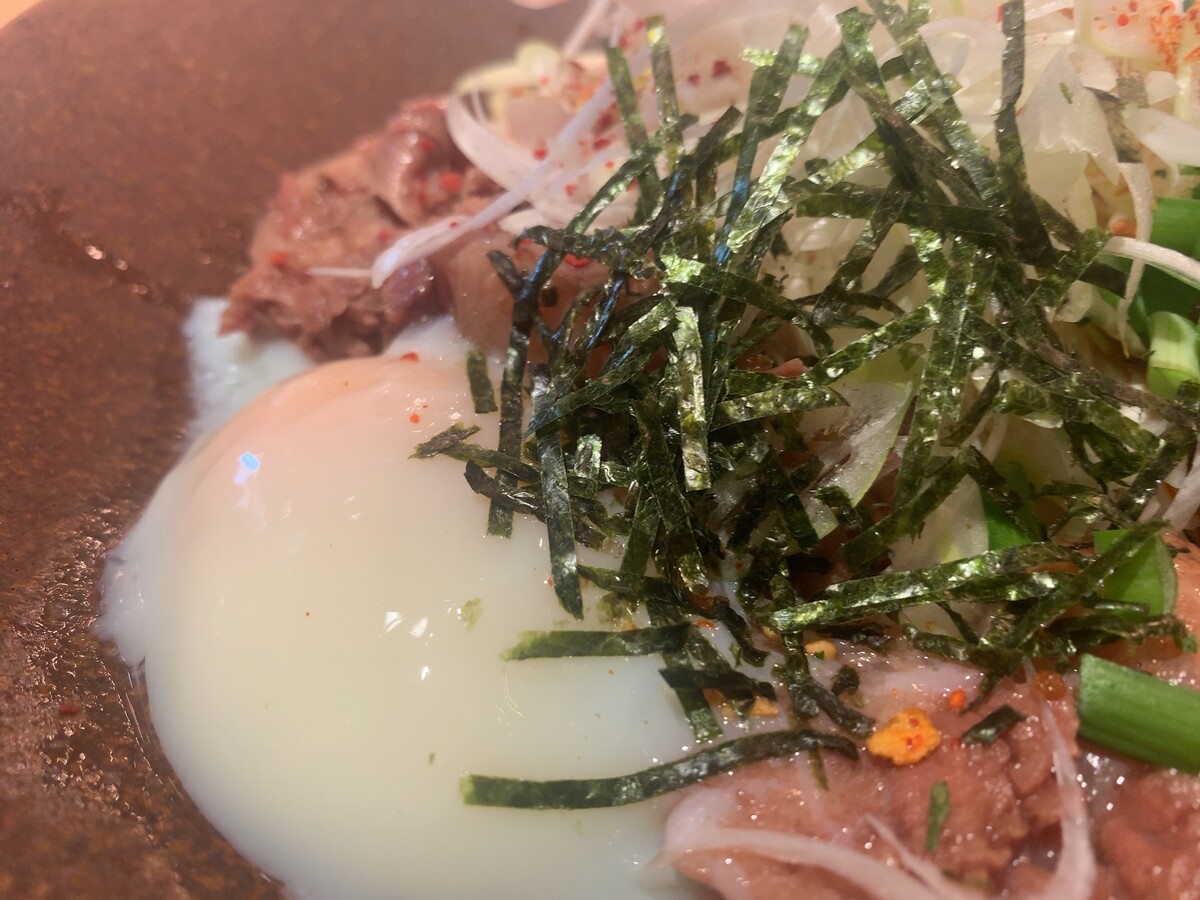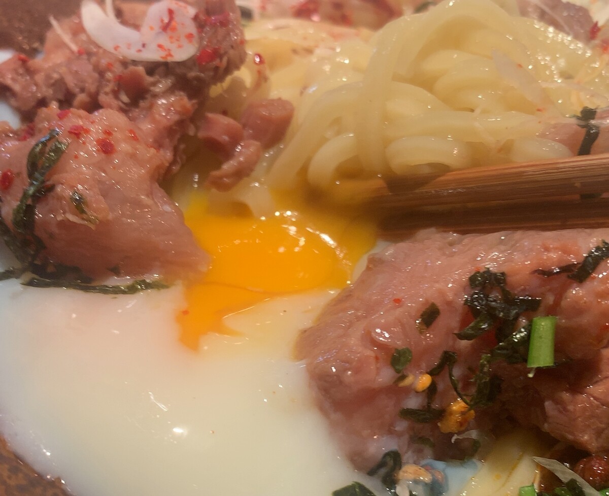 牛スジ旨辛まぜ麺がメイン(理性が働いている時なら隣のミニ丼にする)。