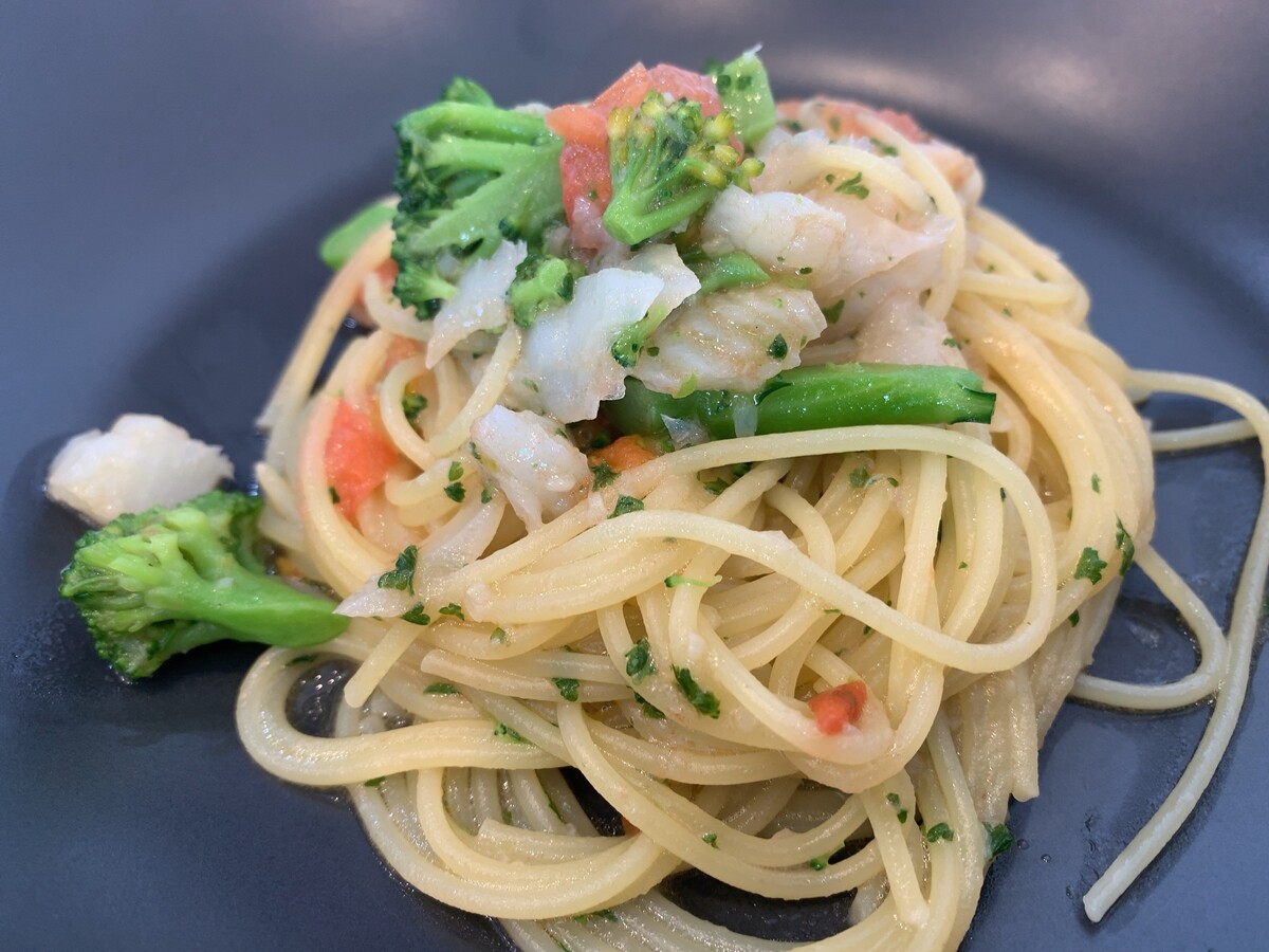 アブラカレイとブロッコリーとフレッシュトマトのスパゲティ。