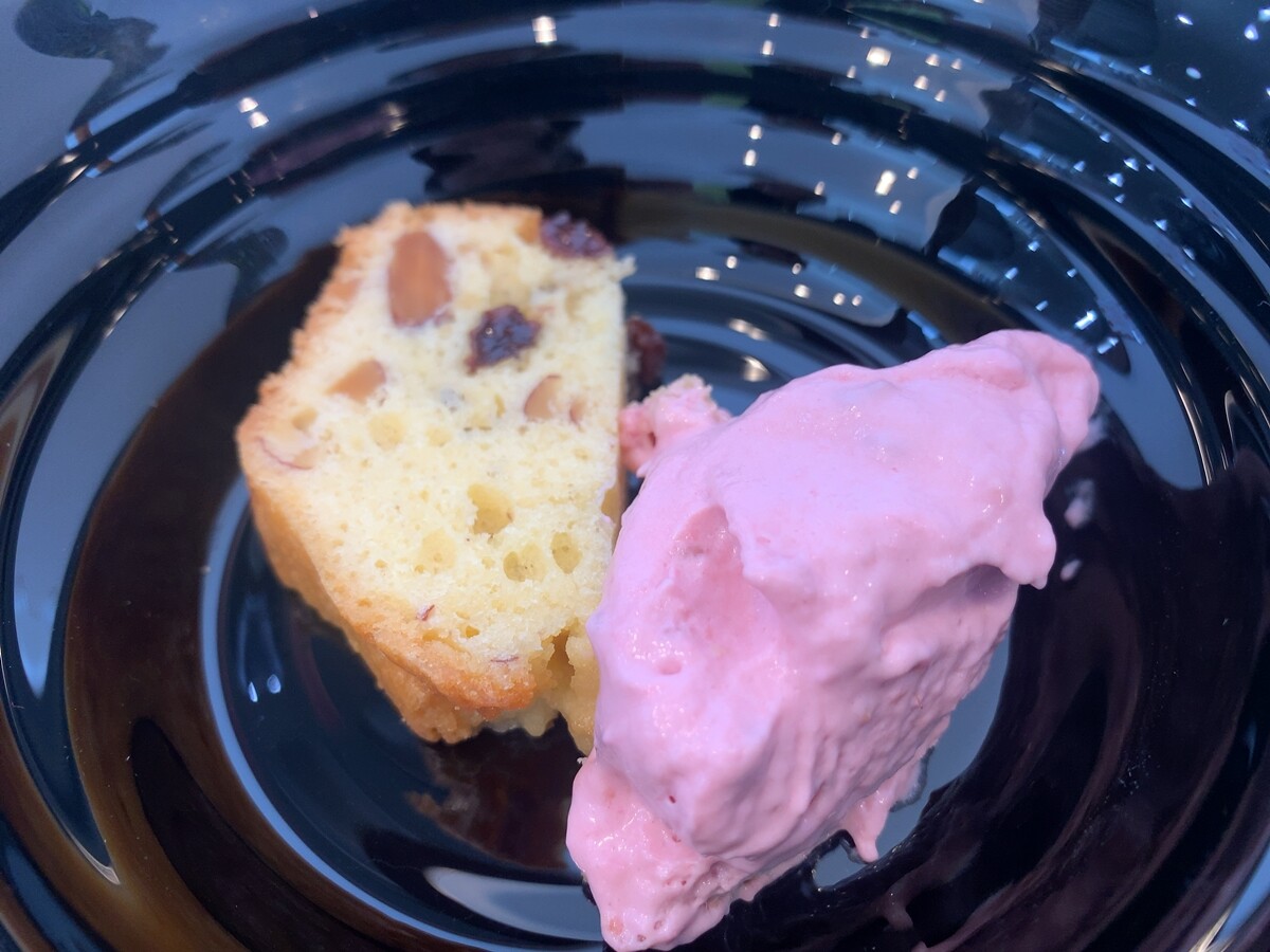 フランボワーズのムースとアーモンドとレーズンのパウンドケーキ。