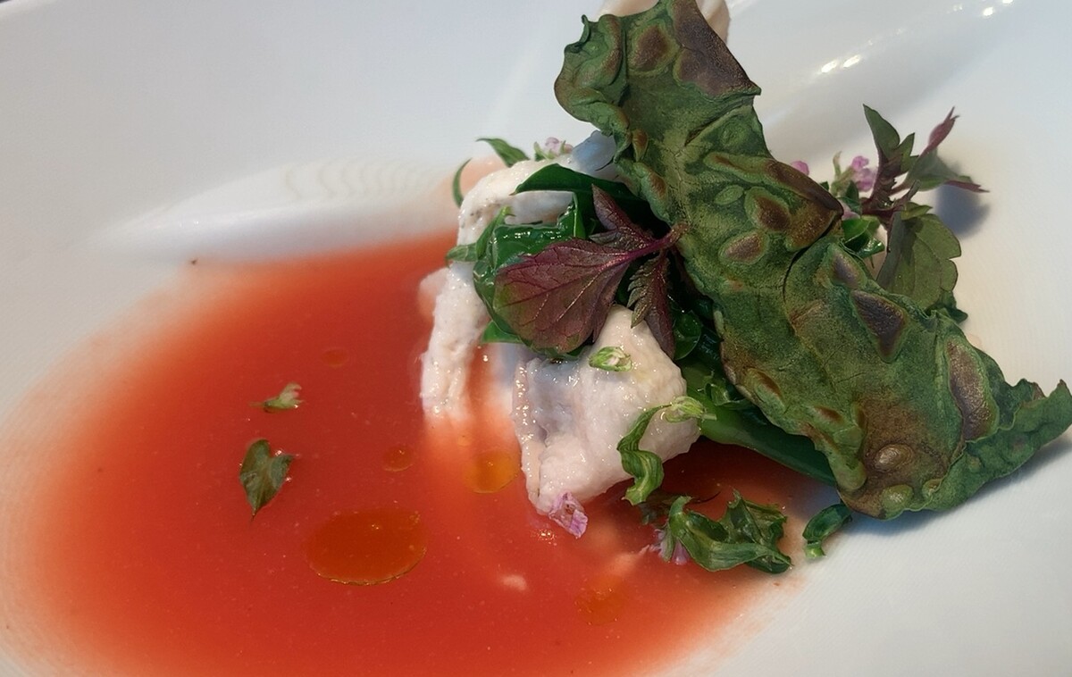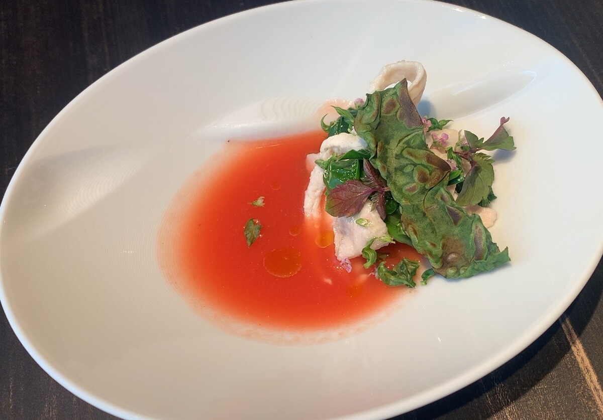 小玉スイカのガスパチョ ツルムラサキと大和肉鶏のエンサラダ。