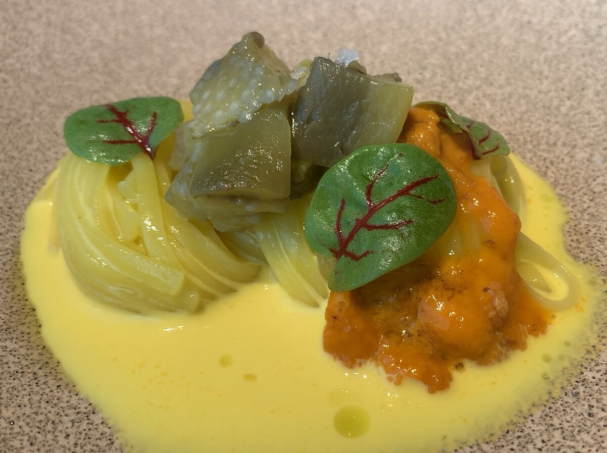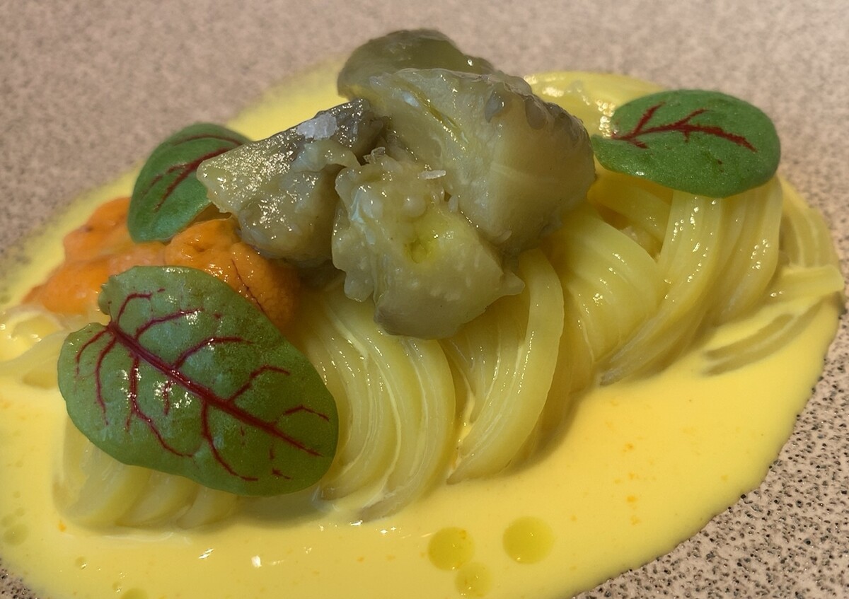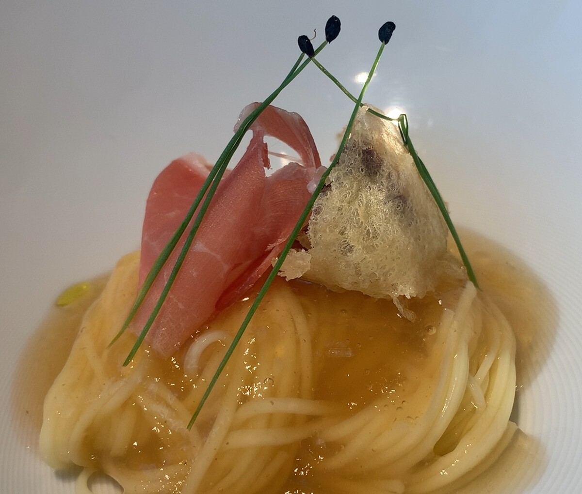 「三輪山本の手延べパスタ麺。生ハム出汁と奈良産イチジクのベニエ」