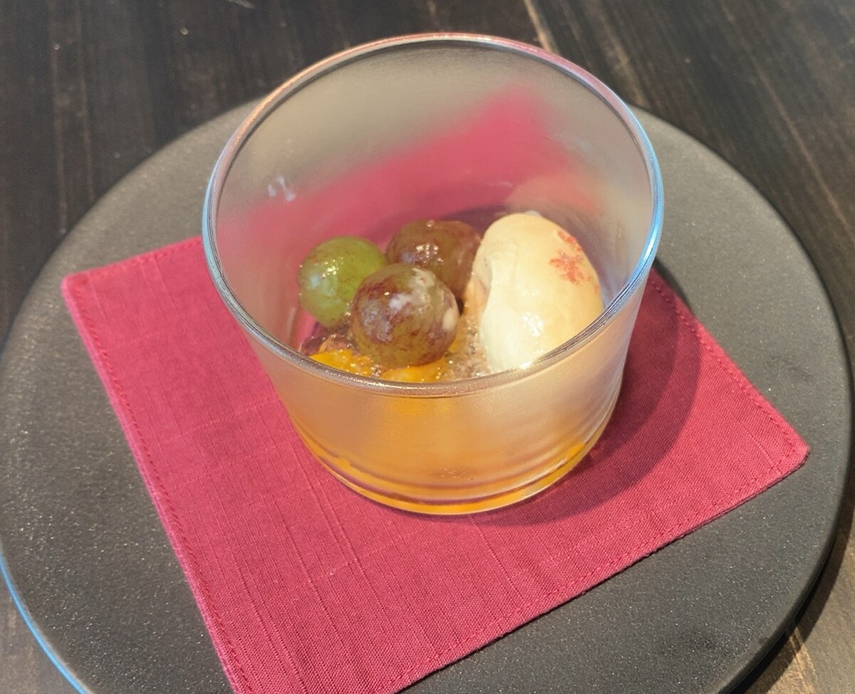 「奈良産ぶどう 白ワインと四季橘のジュレ ペドロとヒメネスのジェラート」
