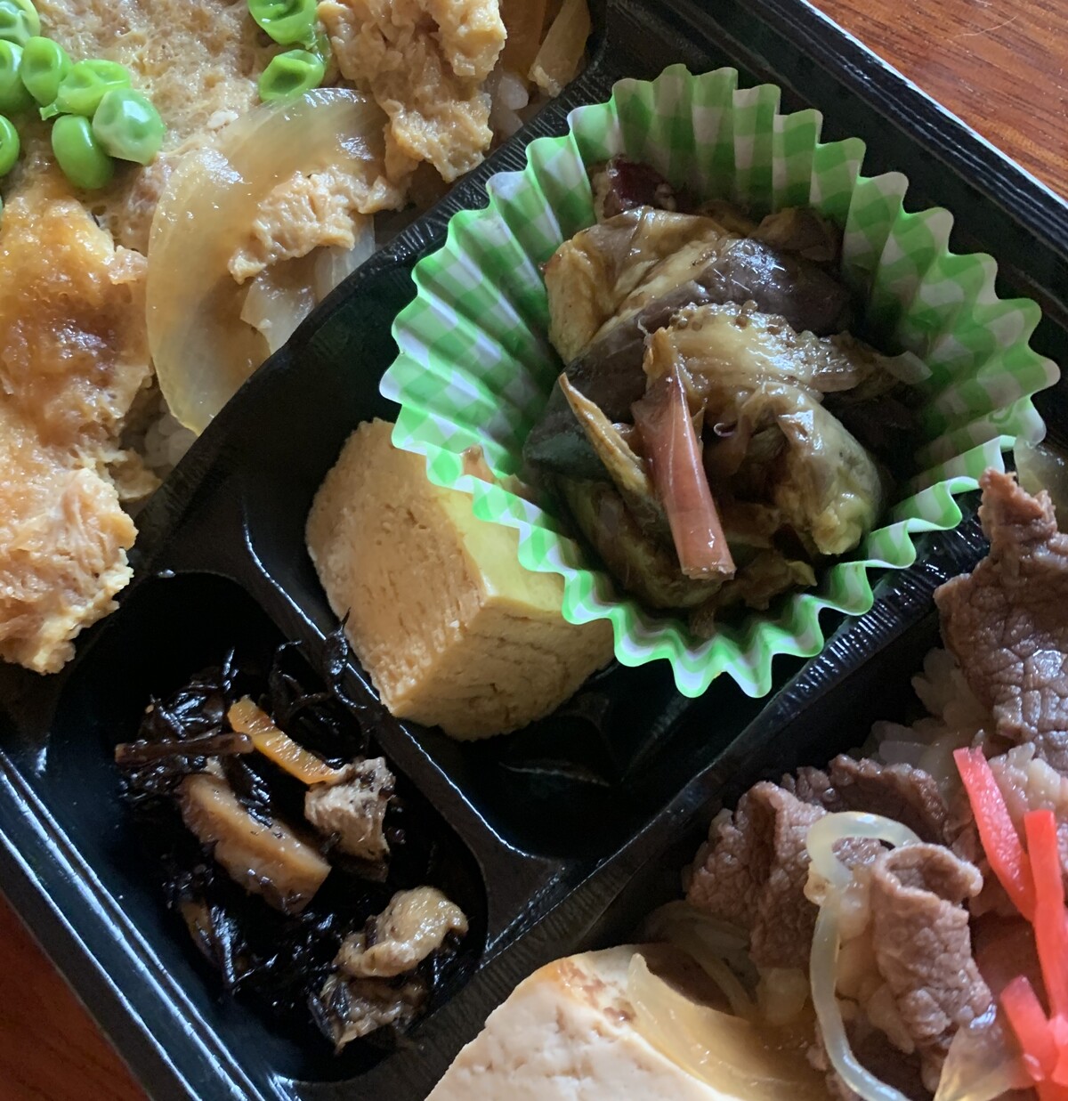 ビバ!ひじき(鉄分)。厚焼き玉子(タンパク質)。ナス(繊維質)。