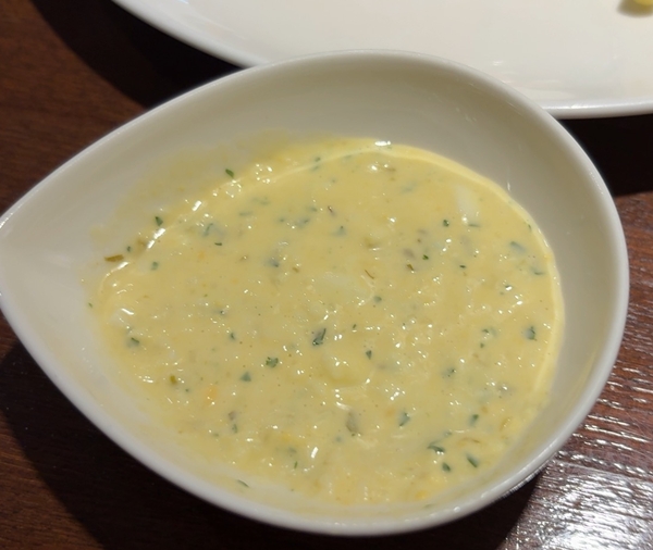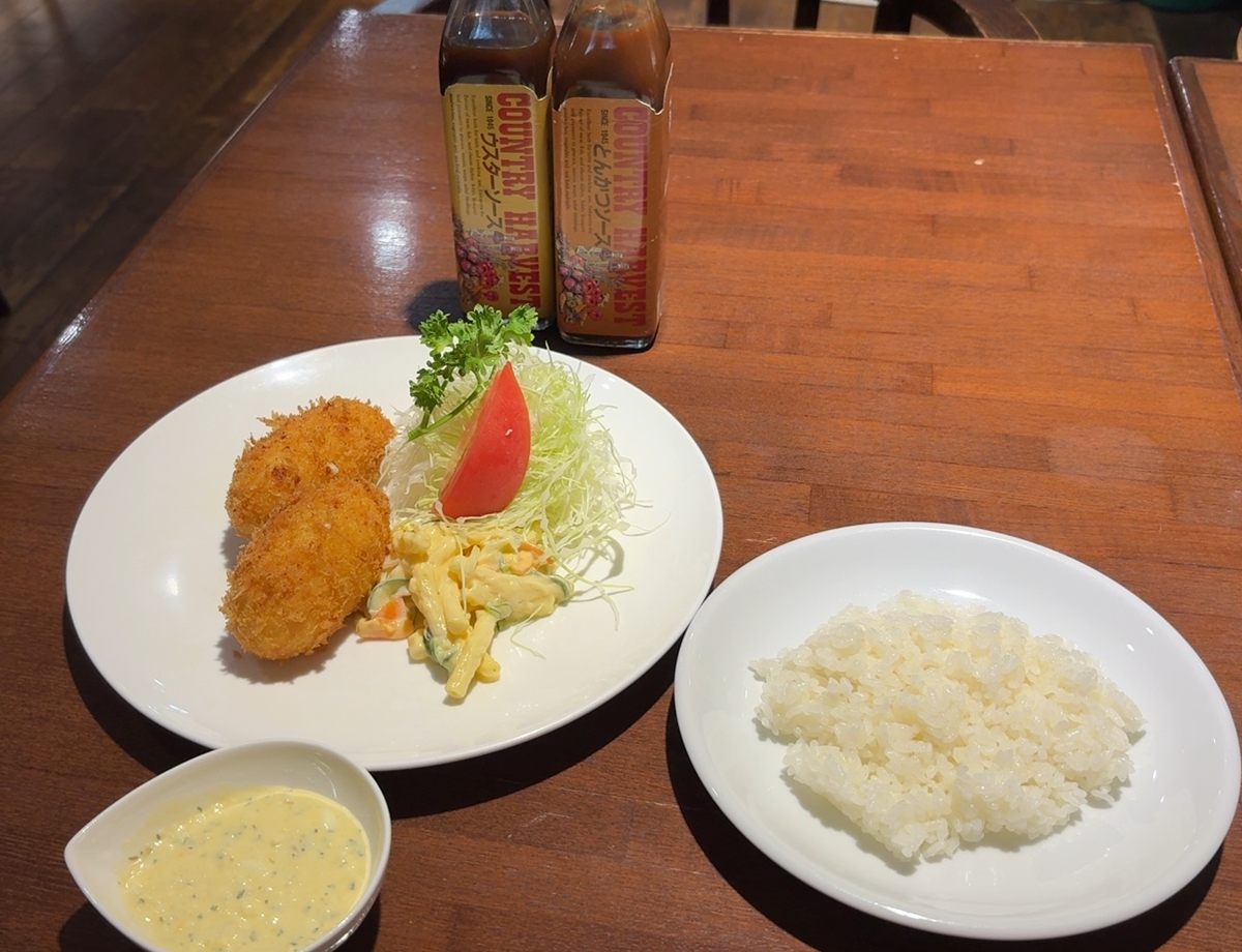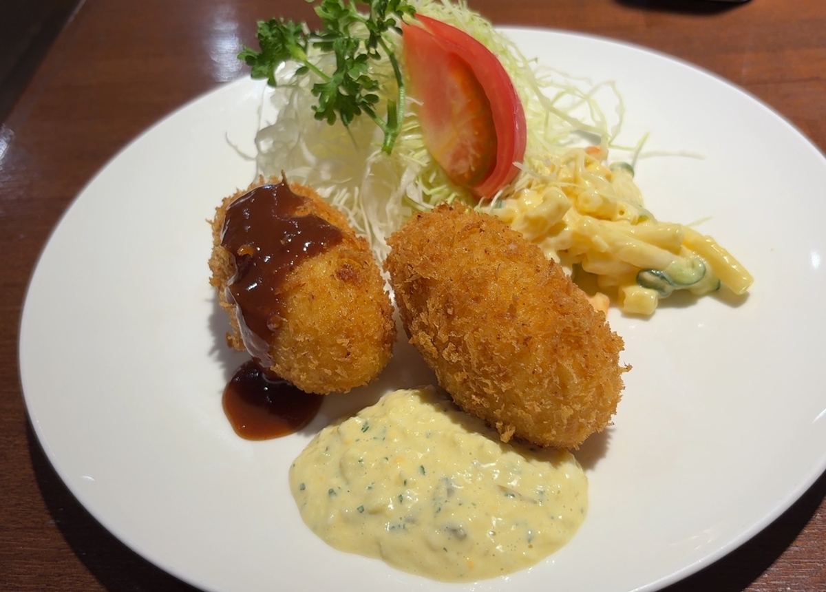 カニクリームコロッケ二個は、タルタルかウスターソースかとんかつソースでどうぞとのこと。
