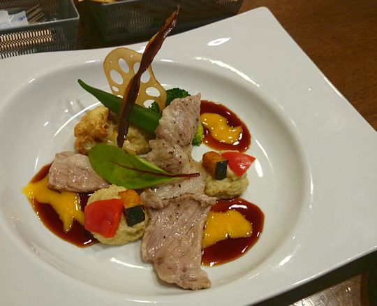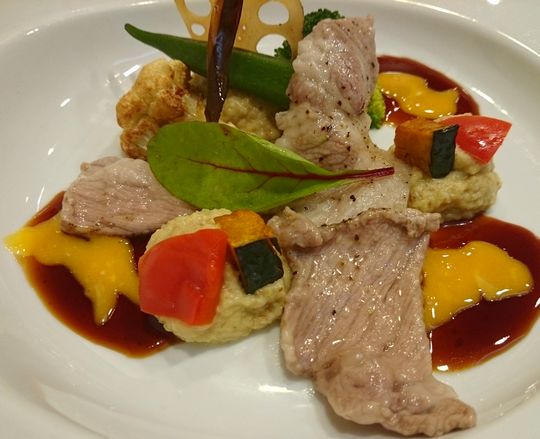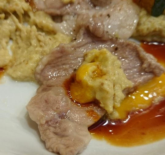 「黒豚の茄子ペースト黄身醤油でございます」