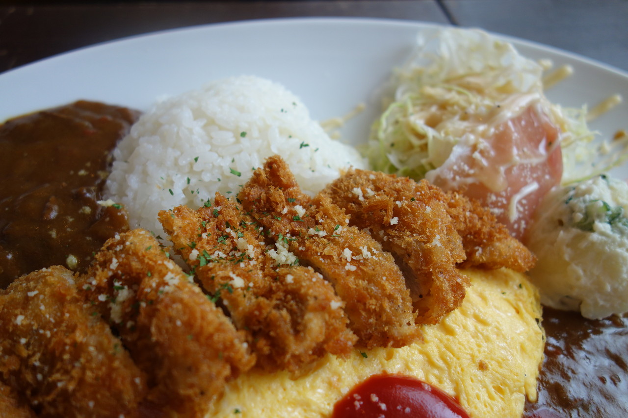 まさかチキンカツも、自分がカレーの海に浮かぶオムレツの上に乗るとは思わなかったと思うの。