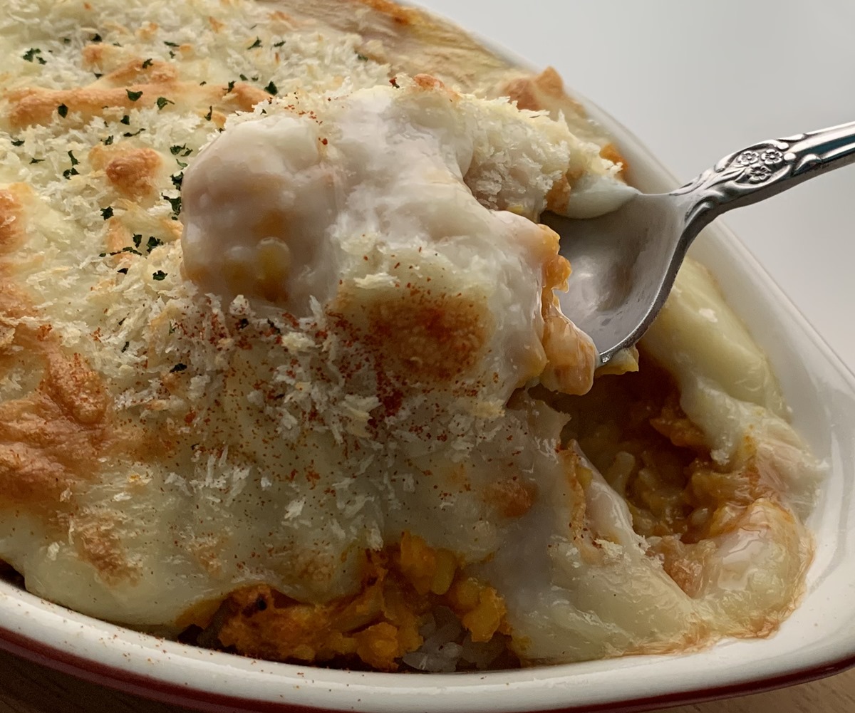小麦粉不使用の緑豆カレーに、米粉と豆乳を使ったホワイトソースがかかっているそうです。
