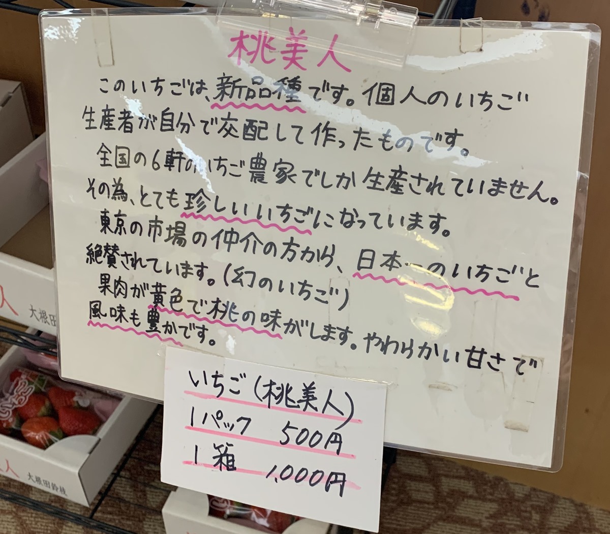 「桃とイチゴを掛け合わせた『桃美人』というイチゴはご存じでしょうか1~2年前から真岡井頭温泉内で1パック500円で販売されておりまして、市場にはまだ出回っていないみたいです」