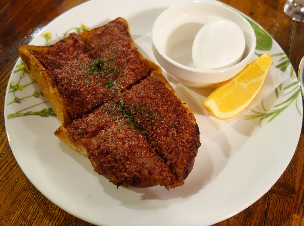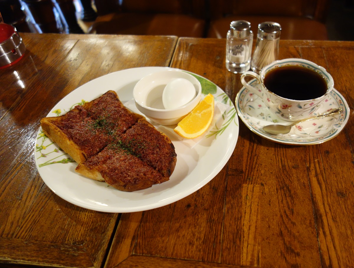 駅前店にはモーニングにない(と思う)コンビーフトースト(1000円+税)にしようか。