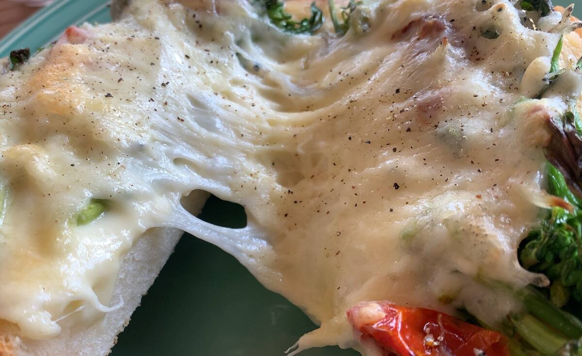 こってりチーズと、ほろ苦い菜の花と、トマトの酸味と甘み、しらすの塩っ気がナイスハーモニー。