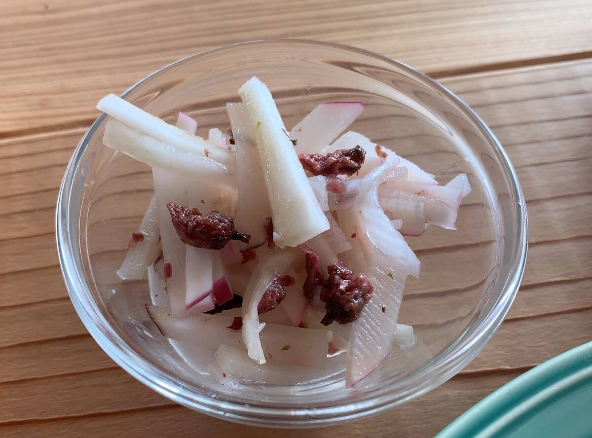 なんでしょう。桜の花と大根のサラダ的な。これでご飯が食べたい。