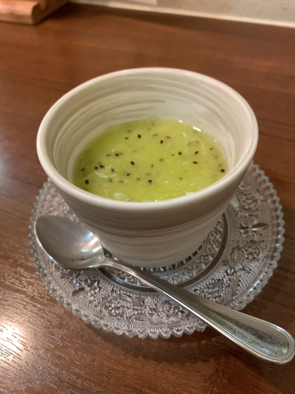 この日のデザート、キウイのパンナコッタのあたりで、ようやく「祭り(ライブ)は終わった」気分に包まれる。