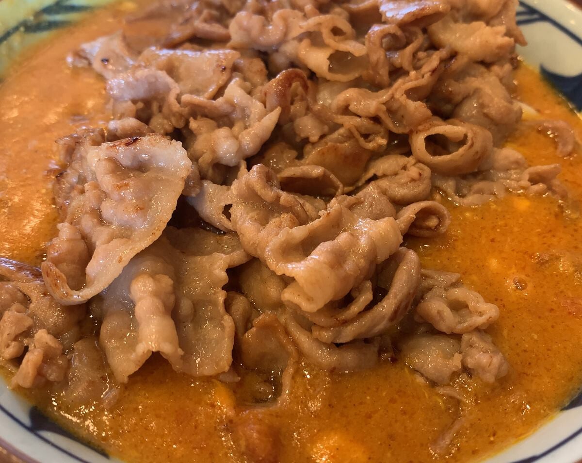大人気の #トマたまカレーうどん は10月中旬で販売終了です!ガッツリとお腹を満たしたい方のために、豚肉のせトマたまカレーうどんもご用意しています✨スパイスの香りと豚肉の旨みが混ざり合い、箸が止まらないおいしさですよ🤤 #丸亀製麺 pic.twitter.com/QVXby8i02y