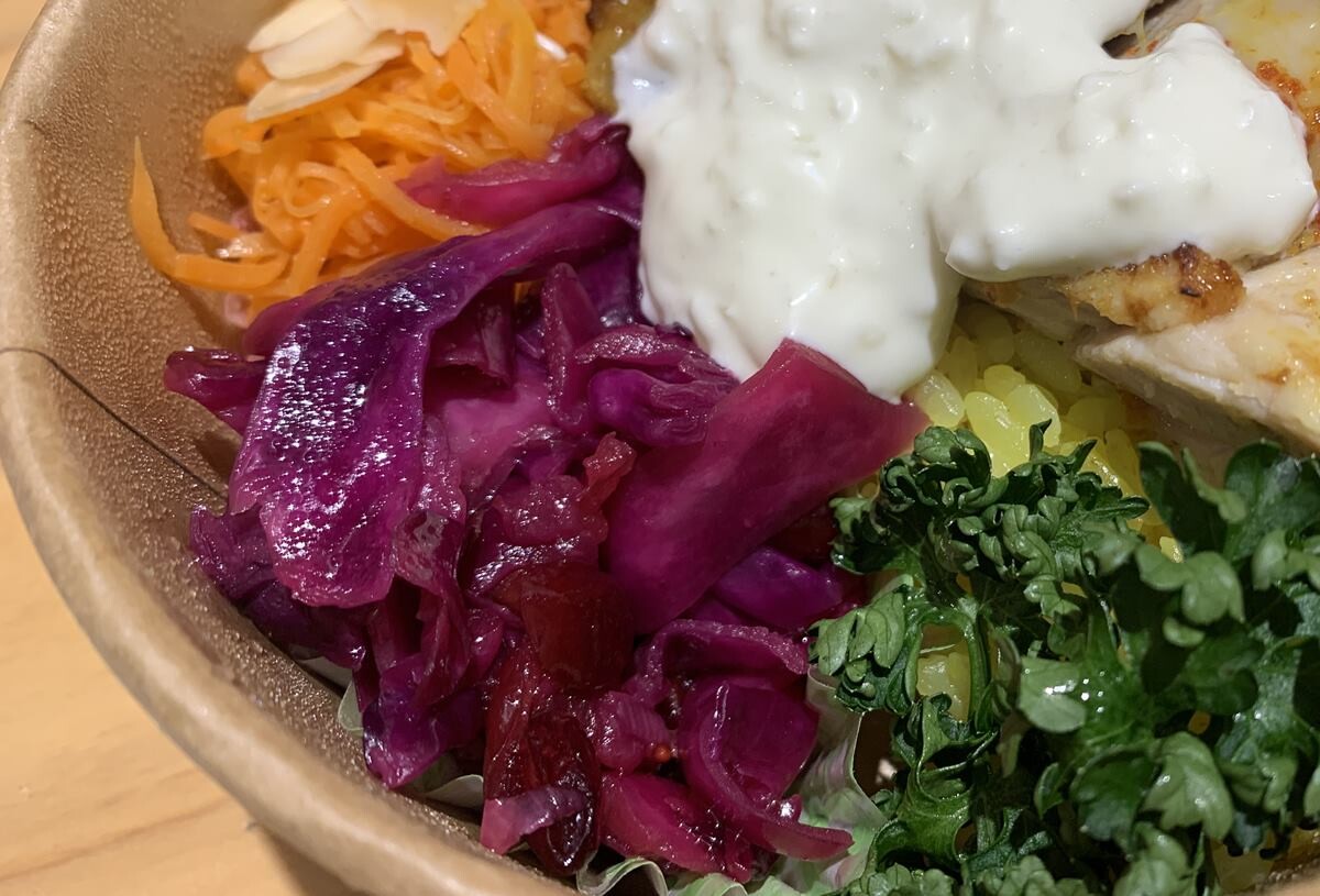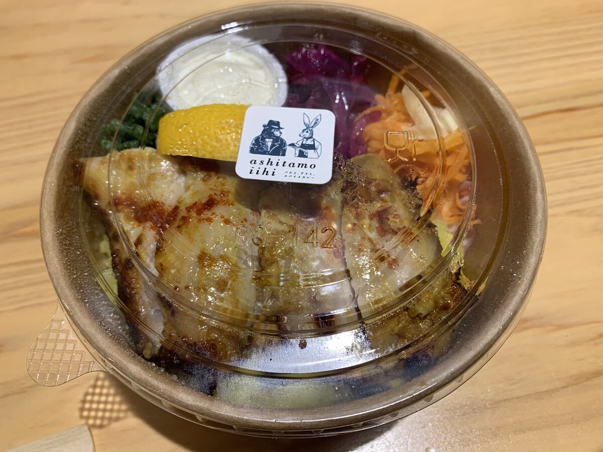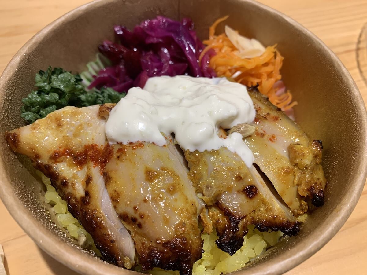 ご飯がターメリックなのも嬉しいし、野菜のデリが二種つくのも、「ヘルシー貯金」で嬉しい。