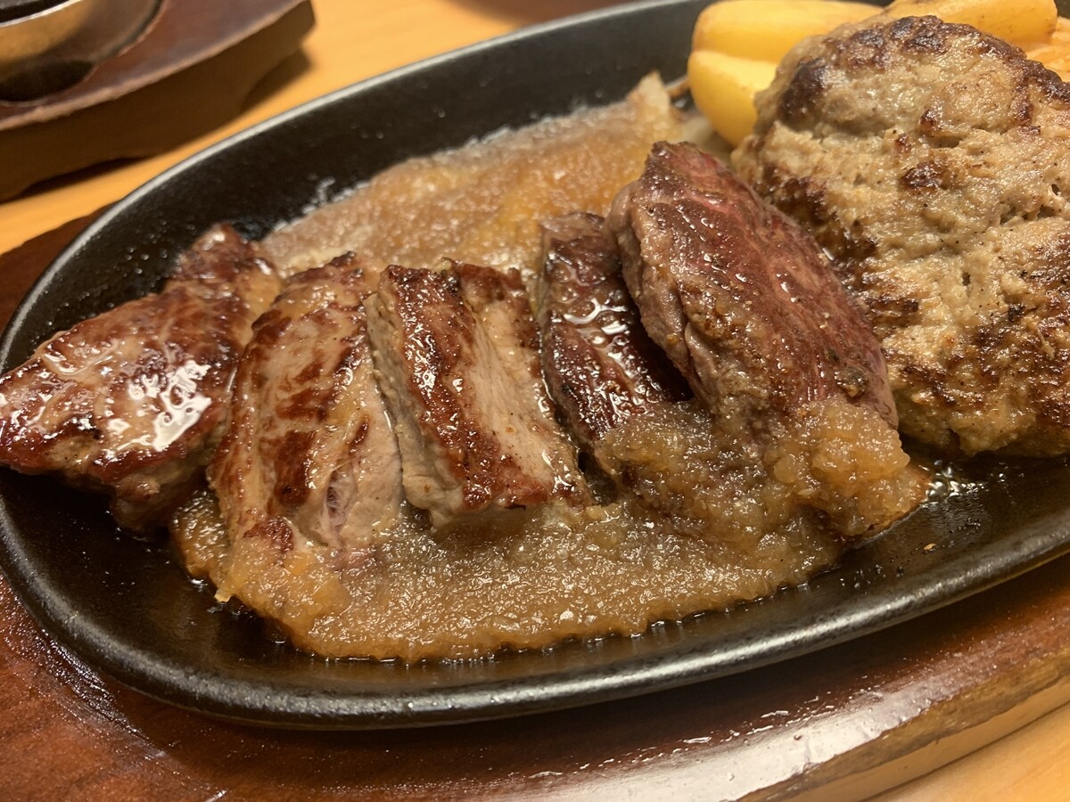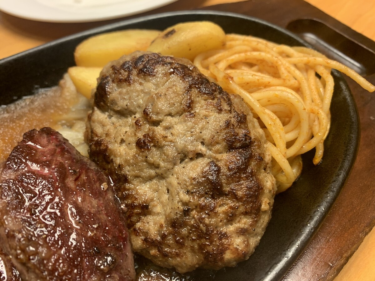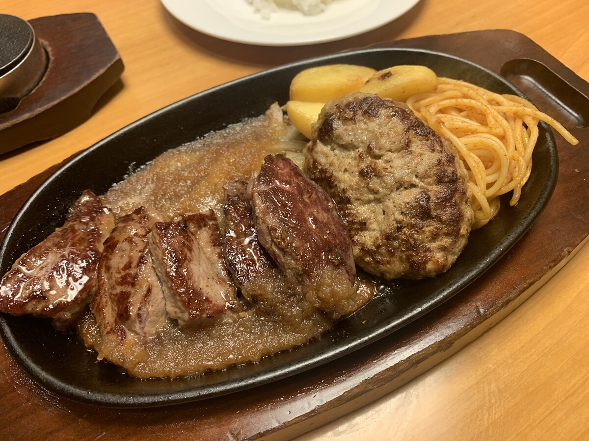 と思ったけど、現実路線で切り落としステーキ&ハンバーグランチ。