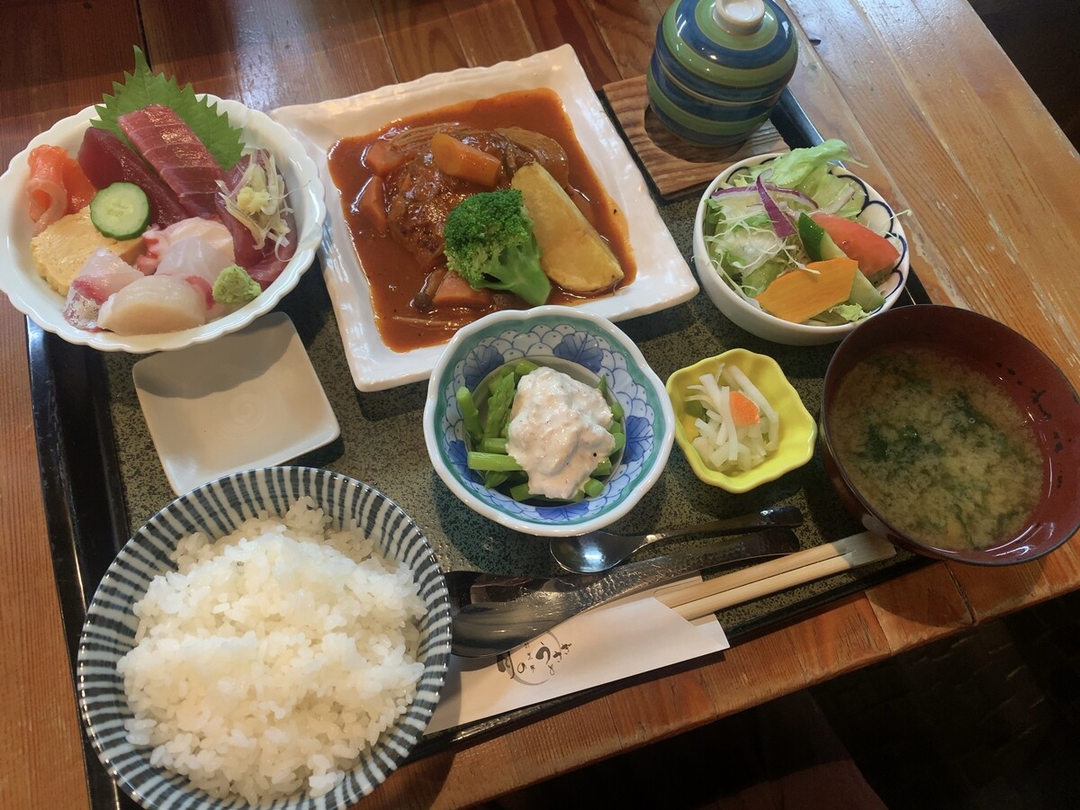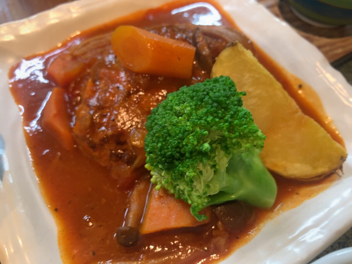 この日は、トマト煮込みハンバーグでした(と、お刺身と小鉢)。