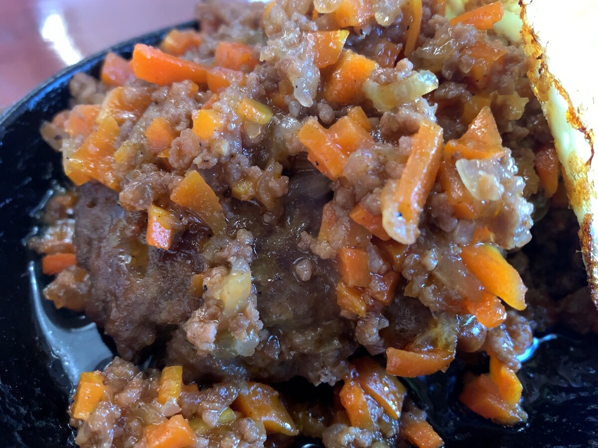 でもって、なんて大きい。溶岩みたい。このハンバーグの上でステーキ焼けるんでは。