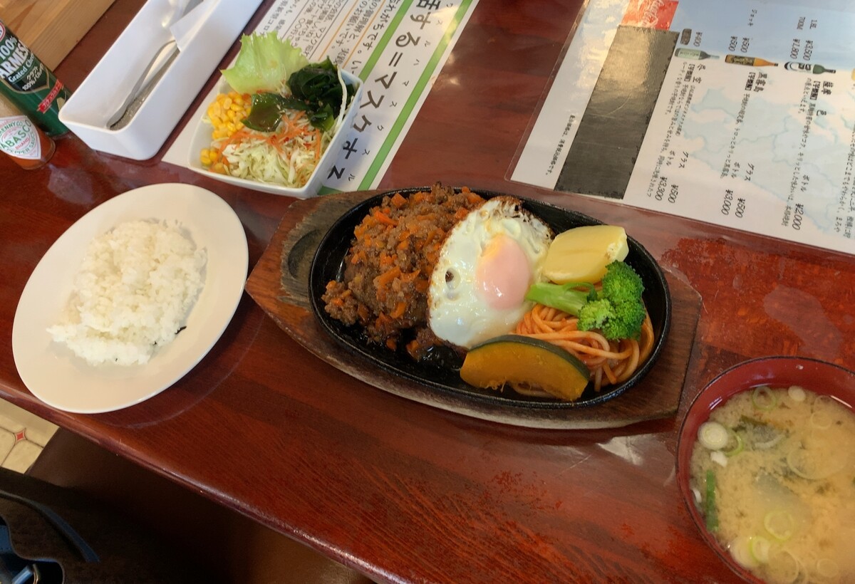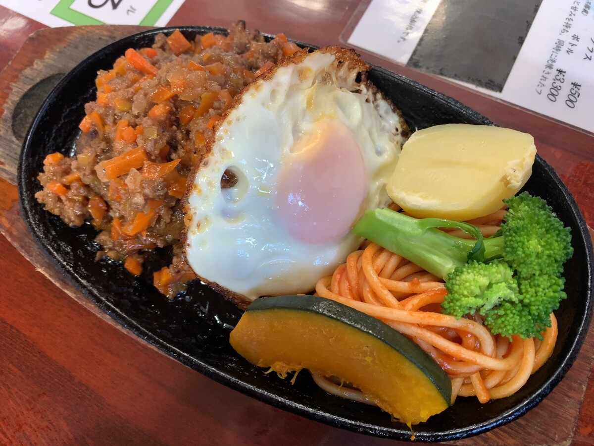 ハンバーグにナポが添えてありますし、根菜類も…。