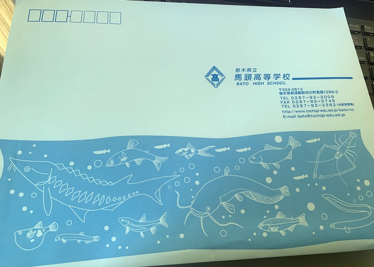 馬頭高校水産科設立50周年で製作された手ぬぐいに使われたイラスト(生徒さんデザイン)が非常~に可愛かったので、作中にも登場していただきました。馬頭高校さんの封筒にも使われてます。