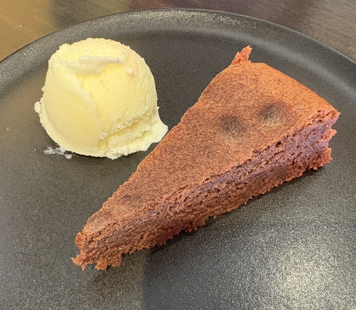 本日のデザートは、チョコケーキ(小麦粉不使用)とミルクジェラード。