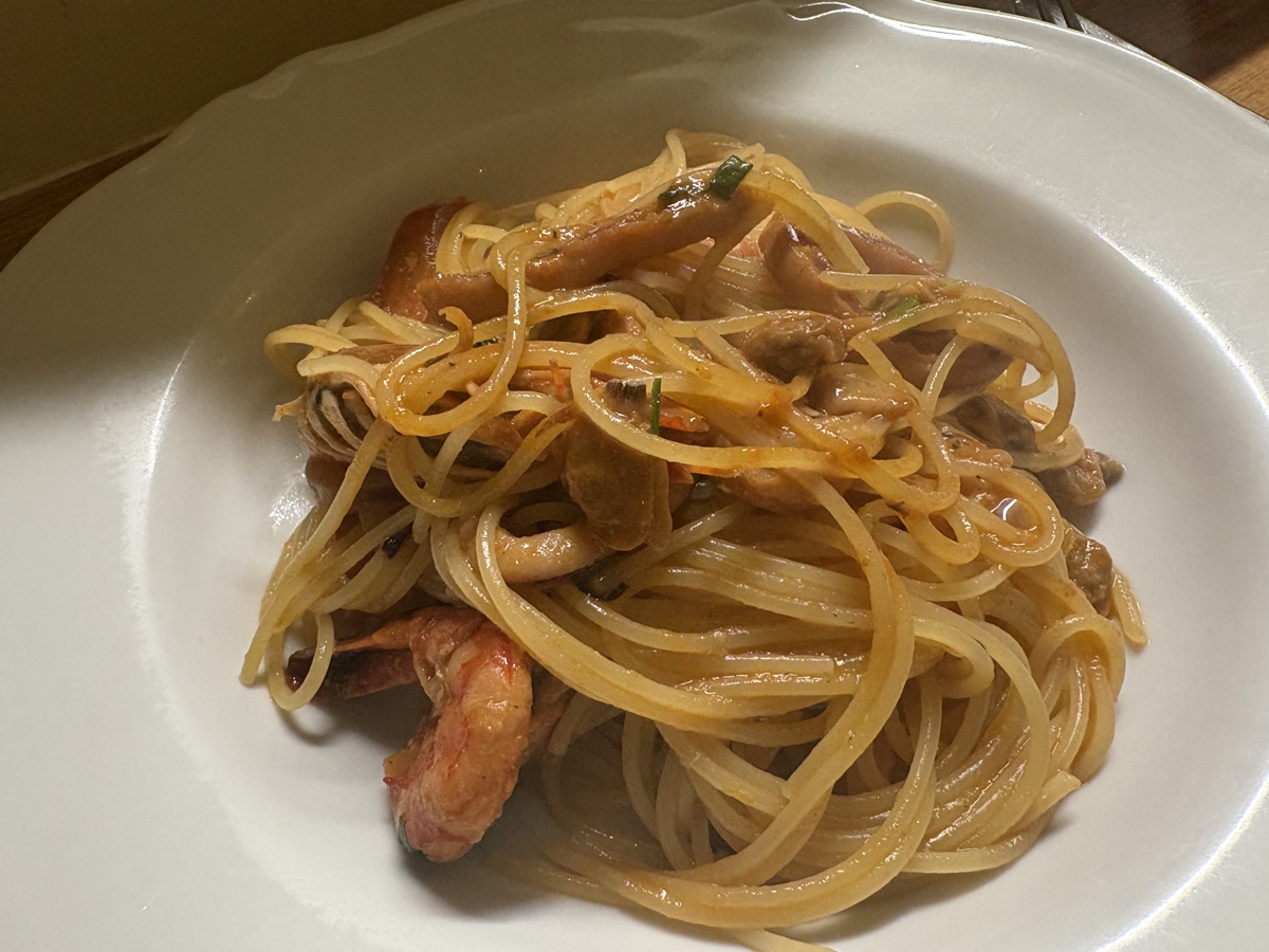 名前は忘れてしまったのですが、海老味噌風味たっぷりのパスタ。