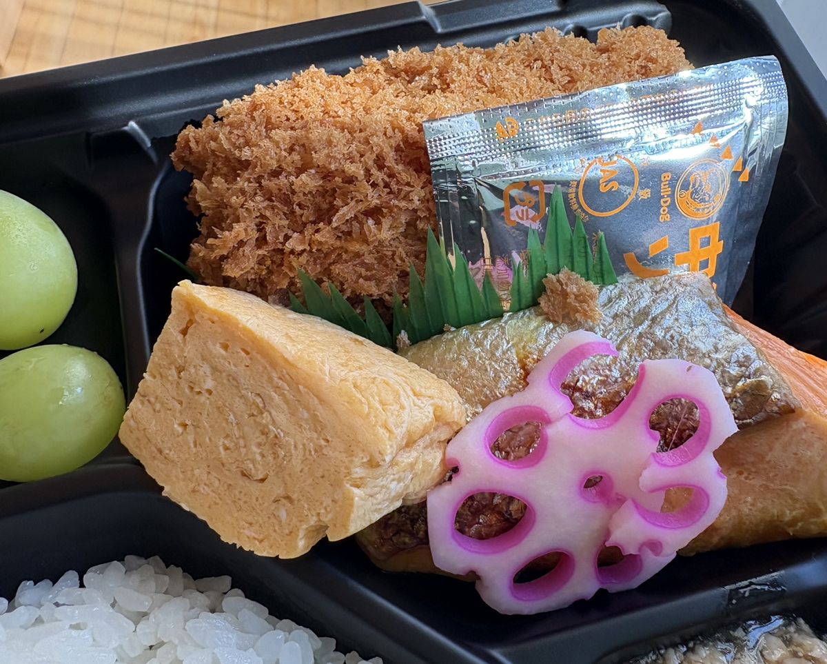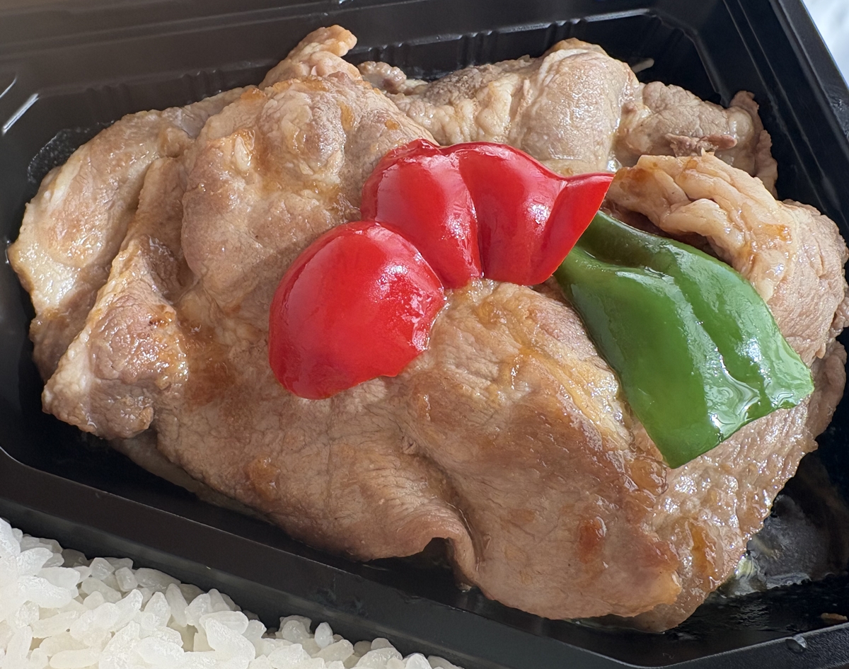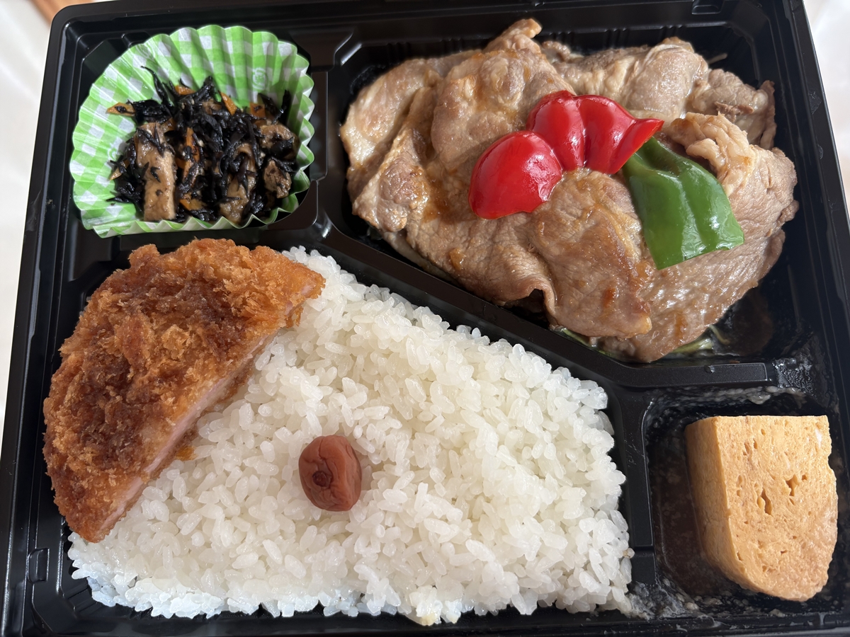 和豚もちぶた生姜焼きとハムカツ・だし巻玉子焼き弁当(900円)。