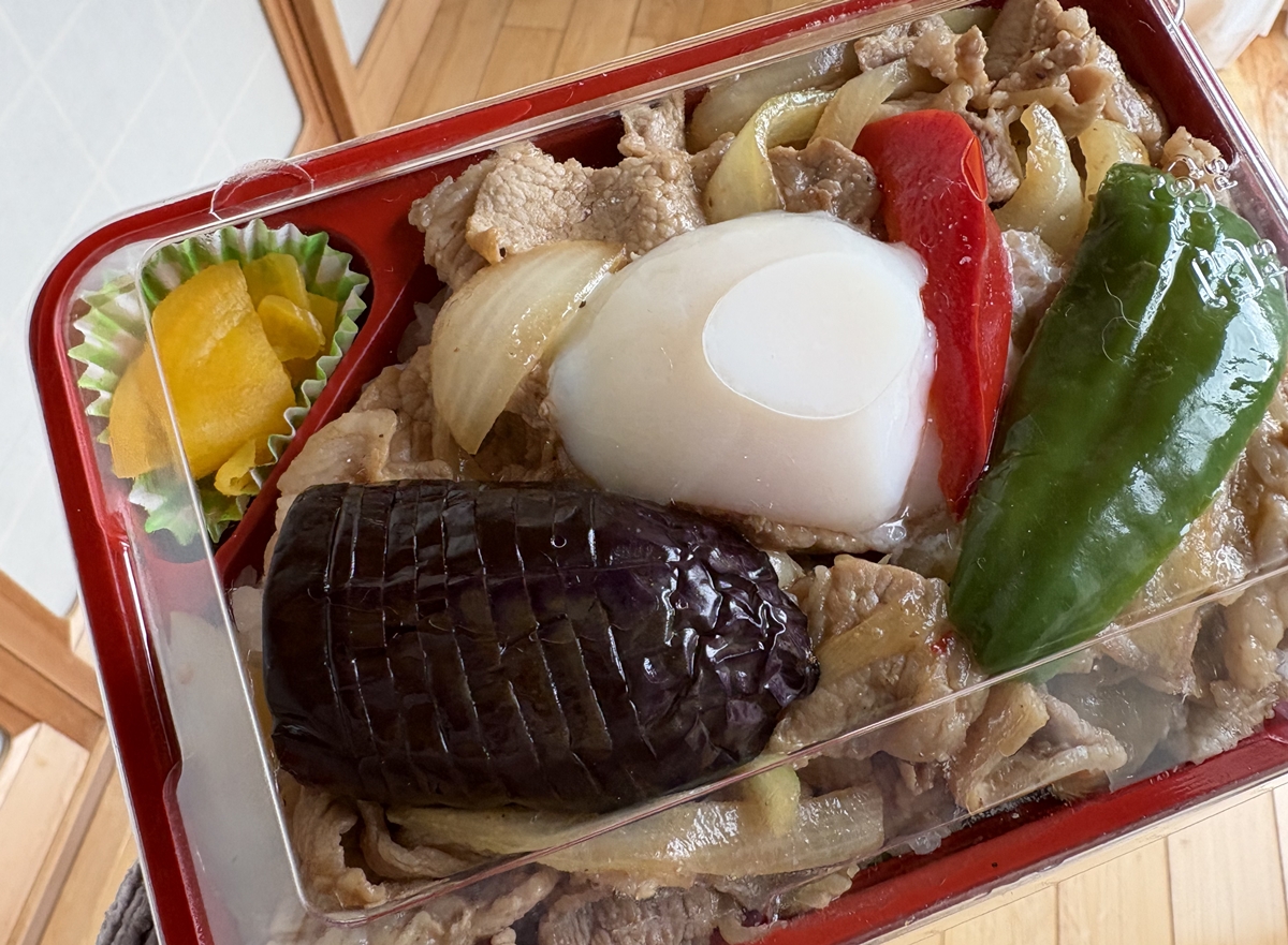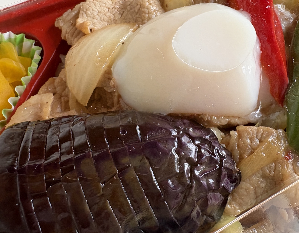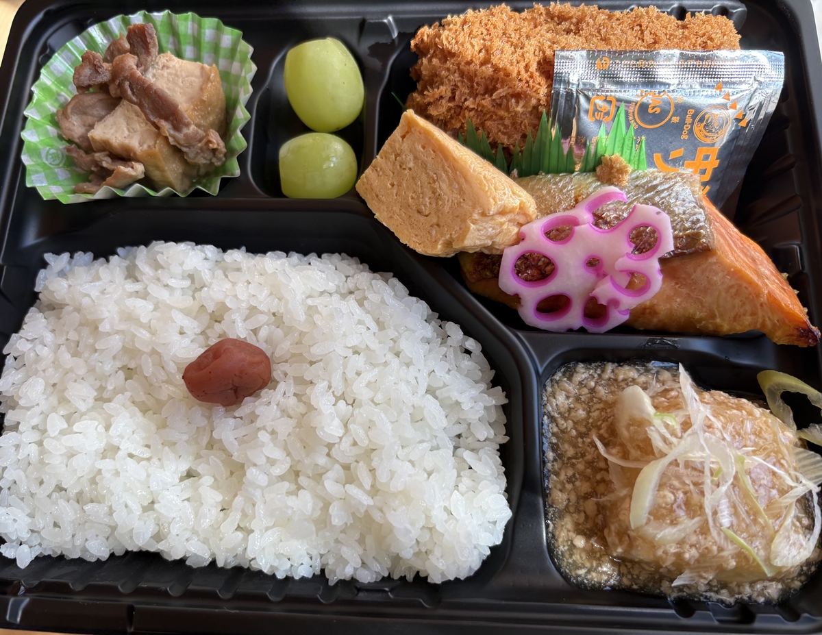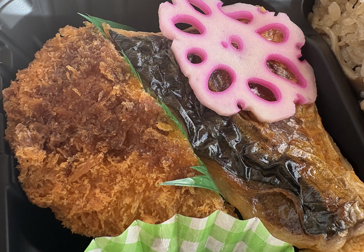 和豚もちぶた生姜焼きとハムカツ・だし巻玉子焼き弁当(900円)。