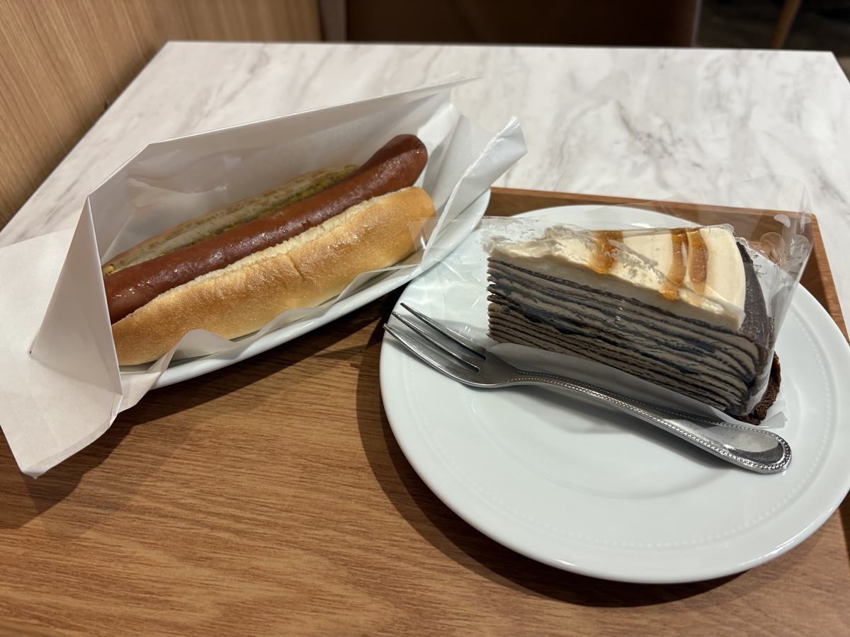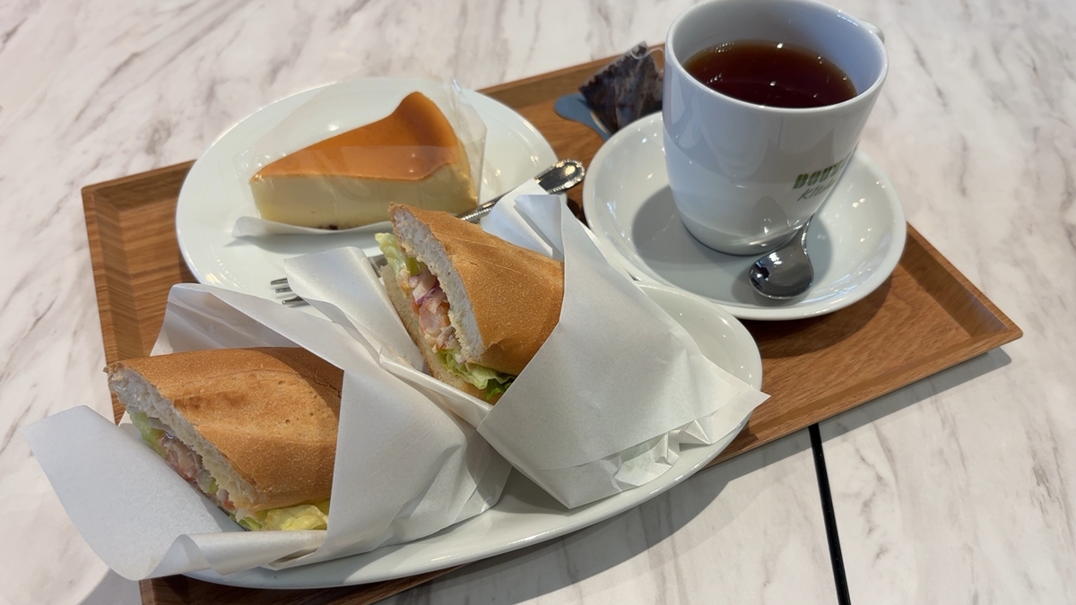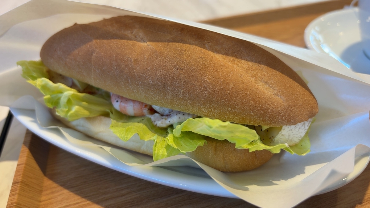 食事は、ミラノサンドB(エビ・アボカドサンドにチーズ入り)か