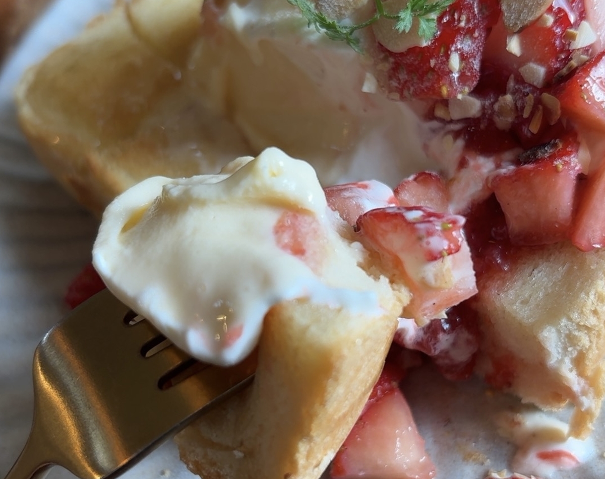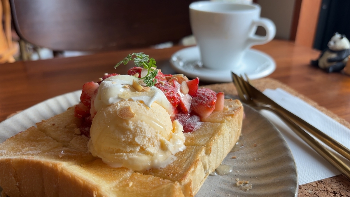 トーストの厚さでとろけたアイスと、はちみつの甘味と、いちごの酸味がたまりません。