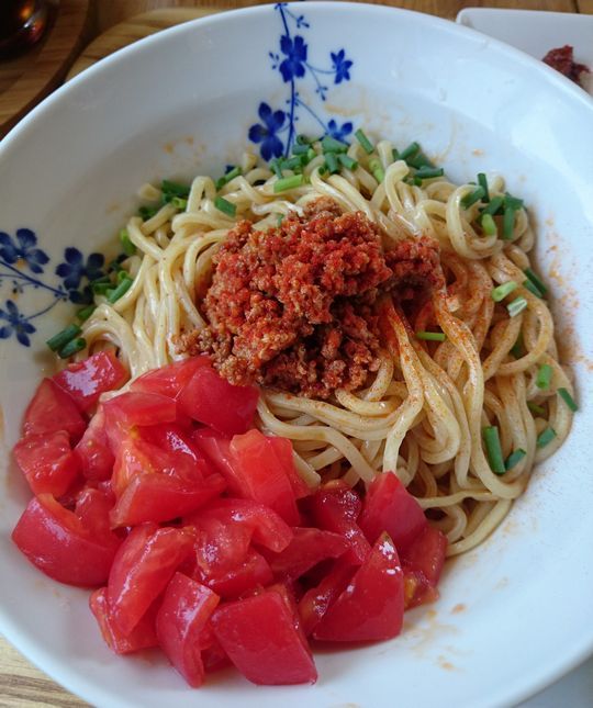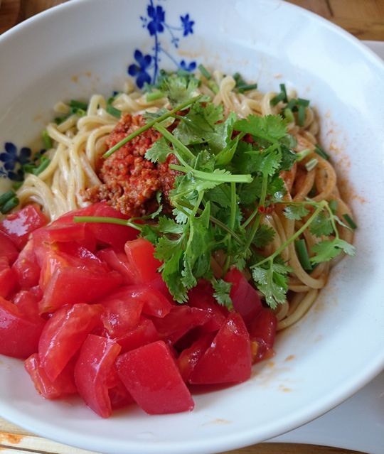 旨辛ひき肉とトマトが乗ってます。