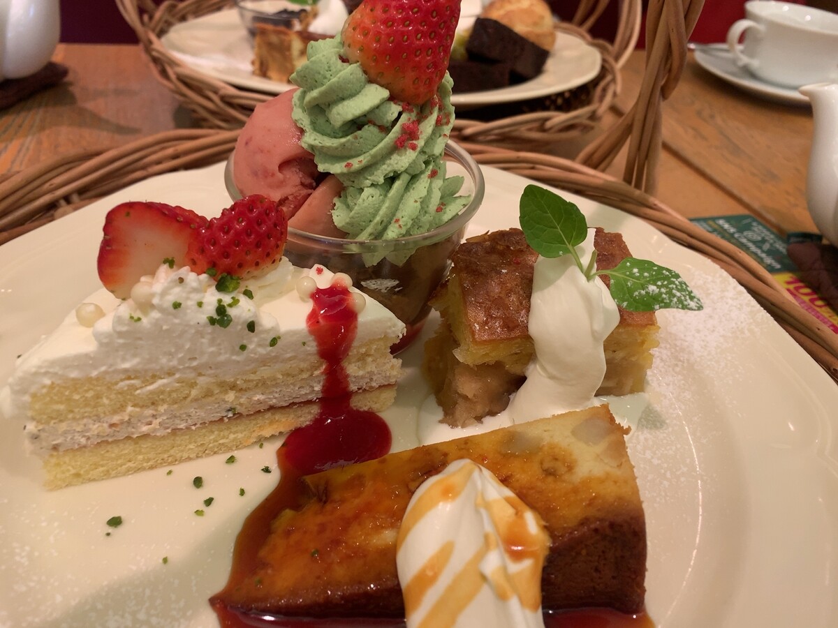 苺とピスタチオホイップのミニツリーパフェ、スイートポテトプディング、アップルパイ、苺とアーモンドクランチのショートケーキ。
