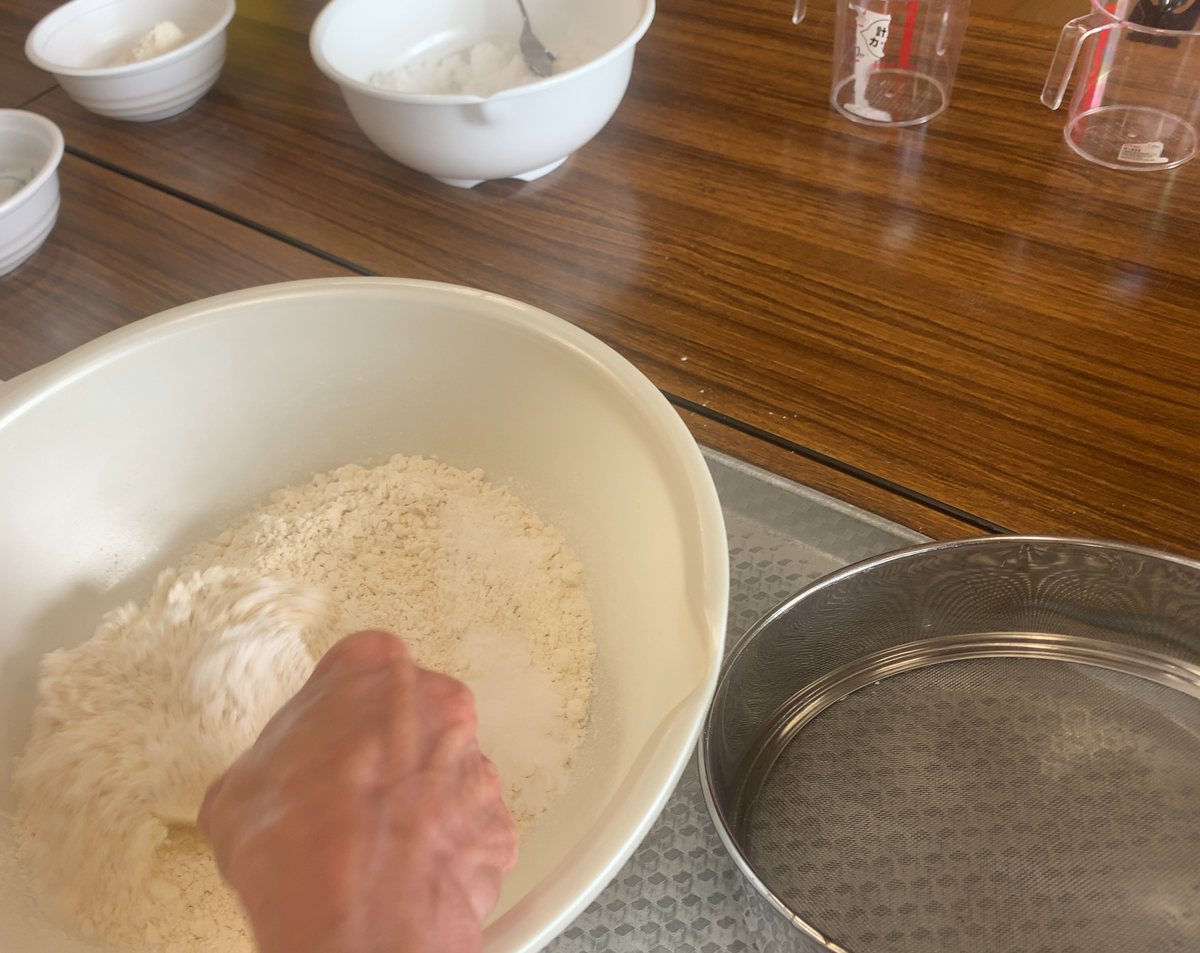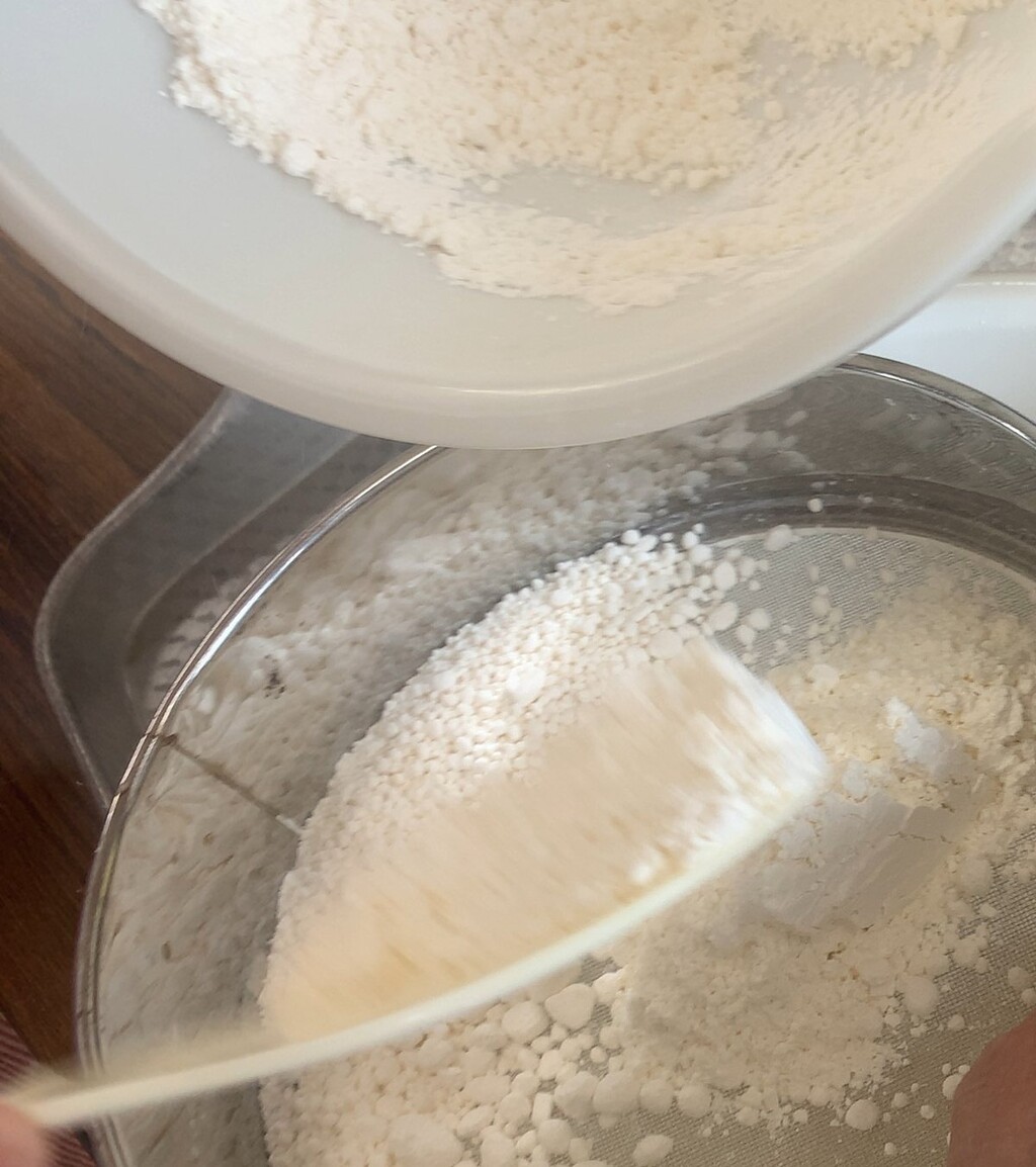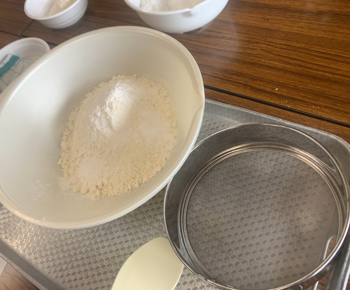 まずは、(1)小麦粉に炭酸とベーキングパウダーをあわせて、ふるう。