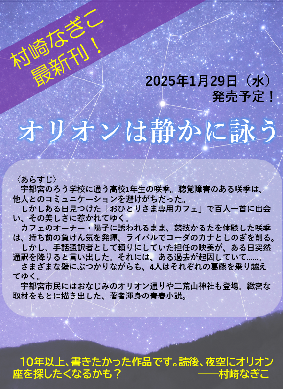 1/29(水)は拙著「オリオンは静かに詠う」(小学館)の発売日です。