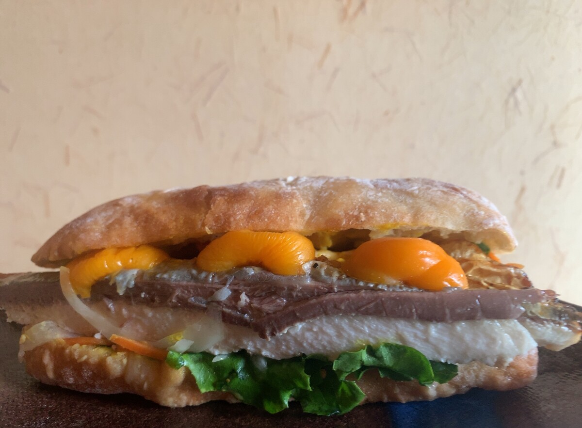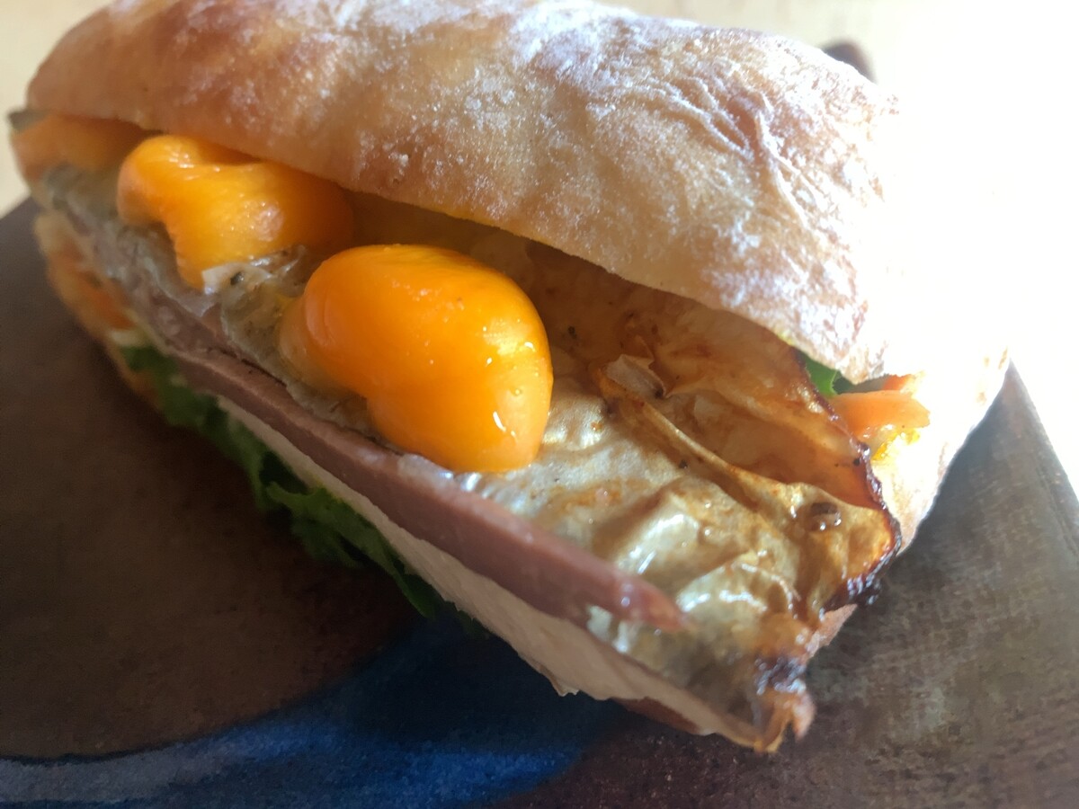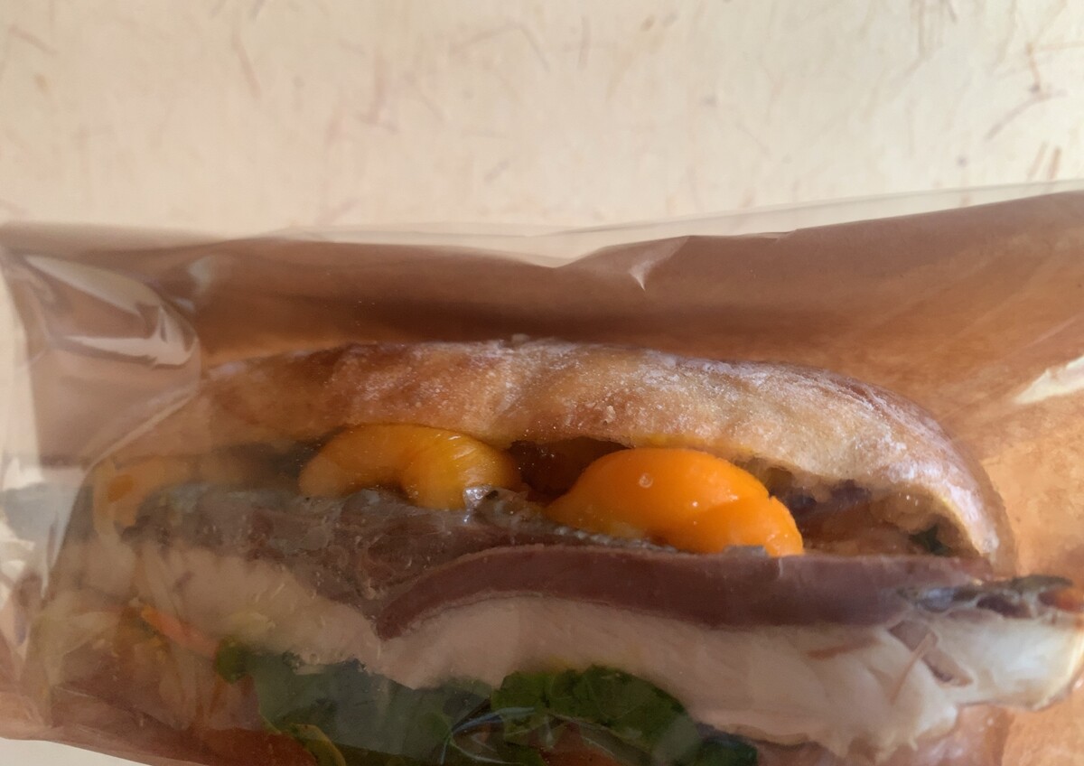 「ほおずきのピクルスと焼き鯖のチャバタサンド」620円。