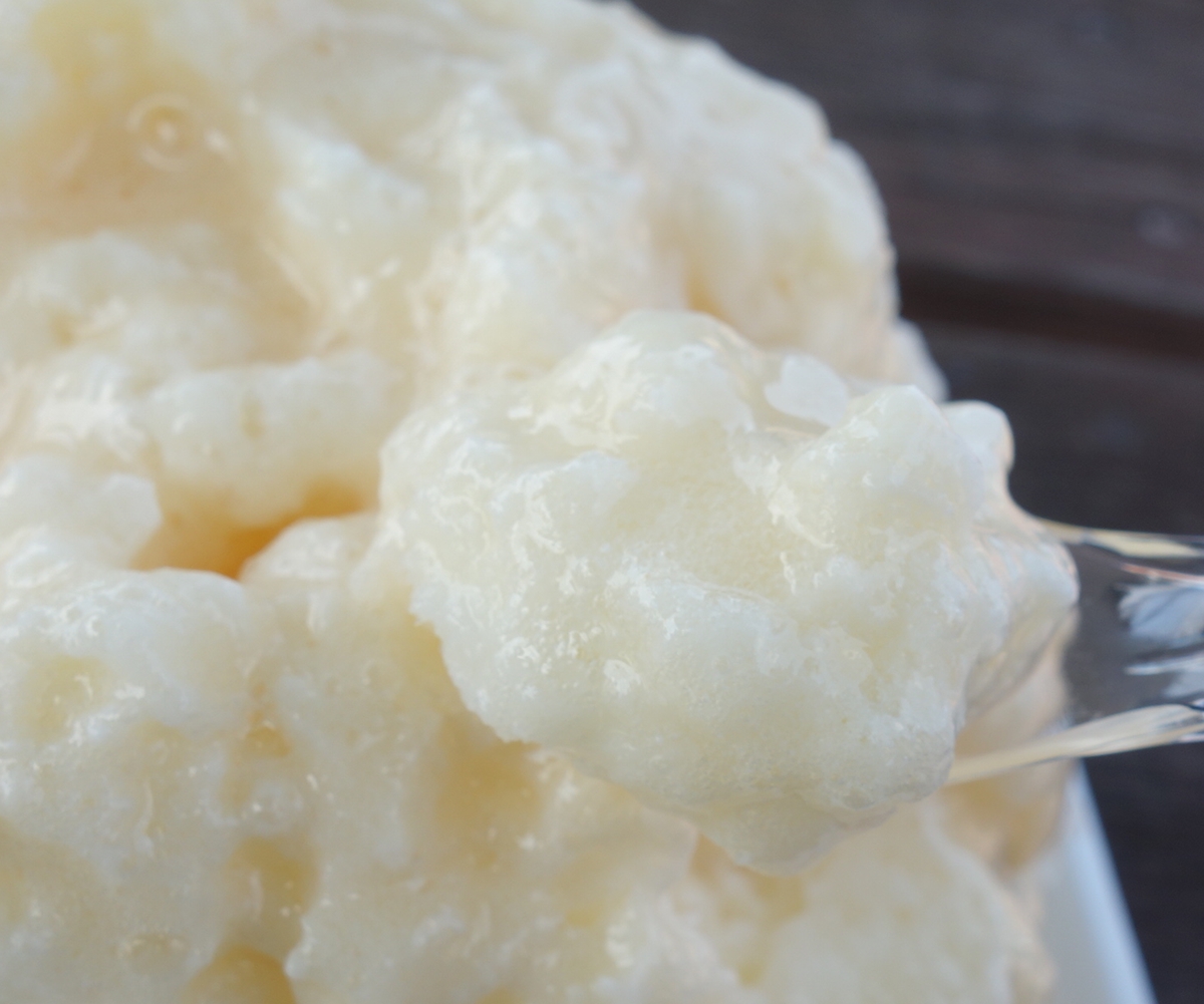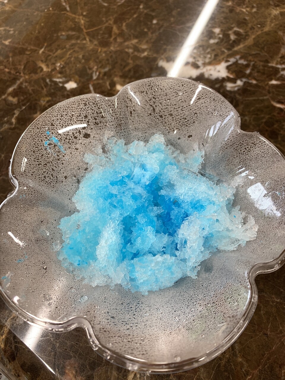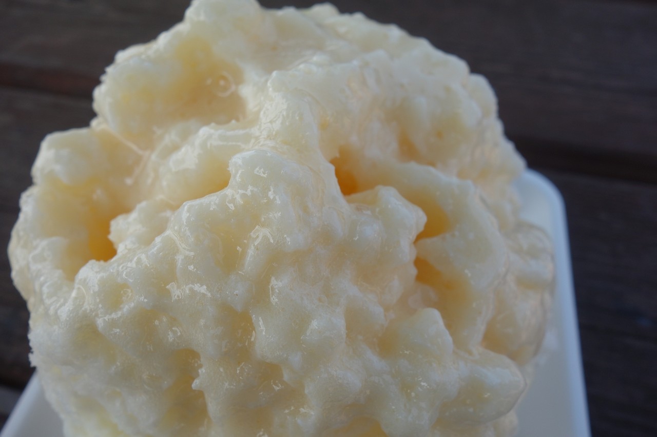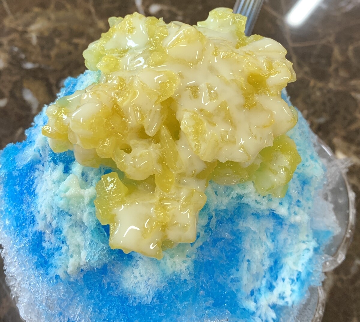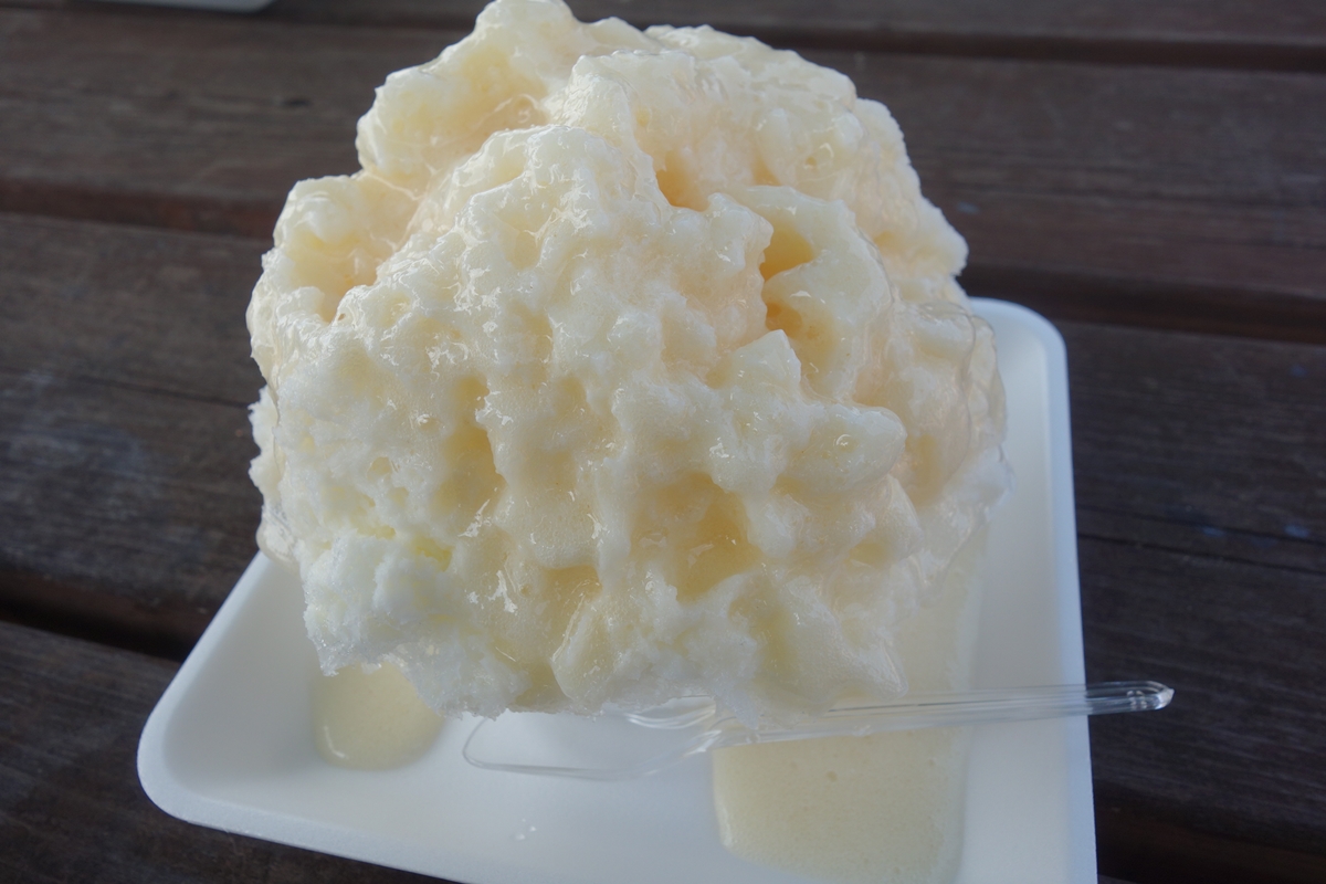 青い海(ブルーハワイ)、白い砂浜(ミルク)、透明な海(氷)、夜の満月(パイン)を想像しながら食べたのでした。