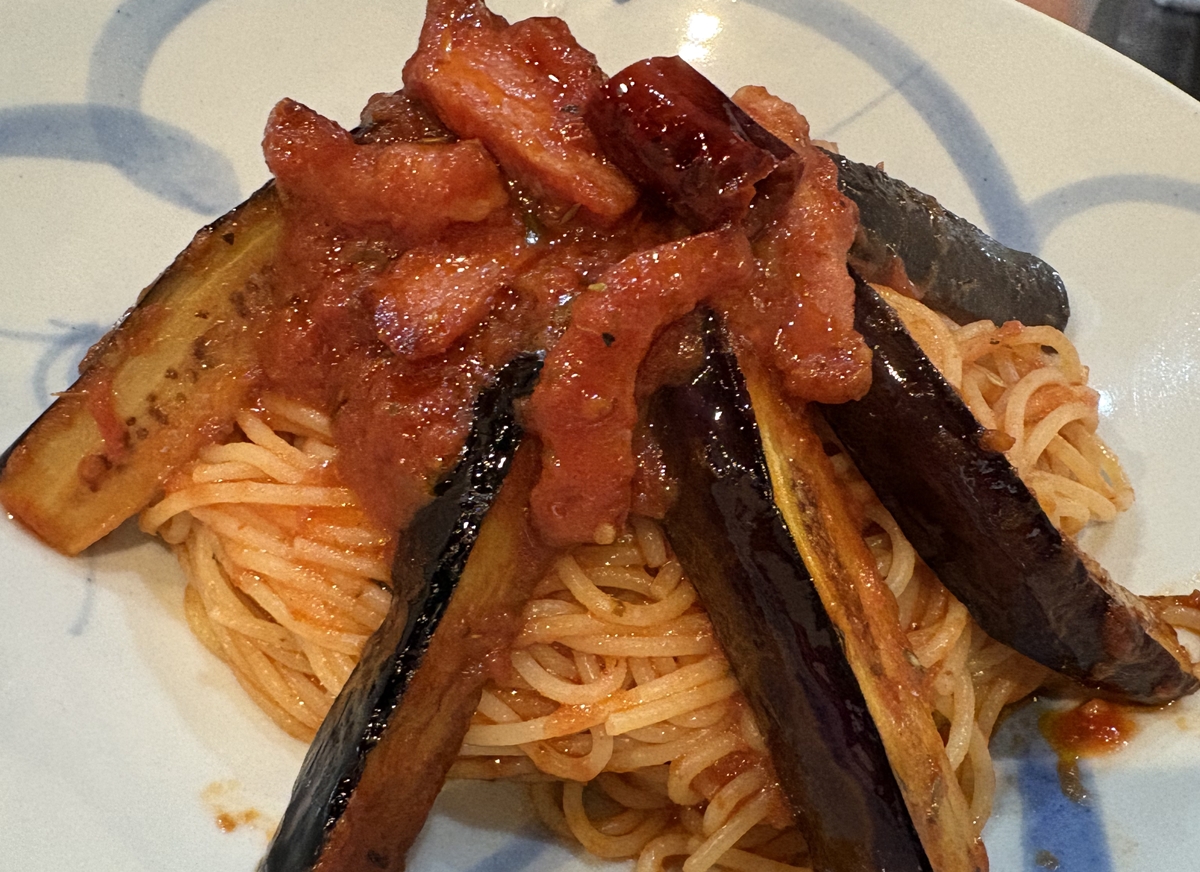 夫は秋茄子とベーコンのトマトソース。