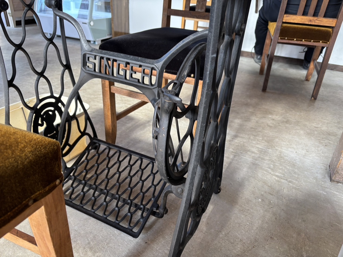 足踏みミシンがテーブルになっている席もあります。